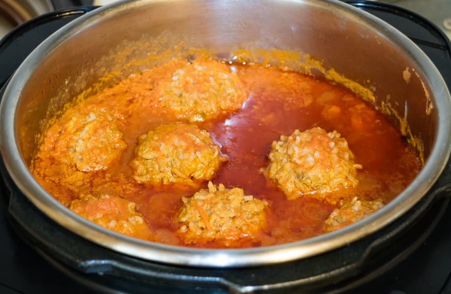 Поджарили на растительном масле мелко нарезанную головку лука и измельченную ранее в тестах на крупной терке морковку. Добавили пару ложек томатной пасты и томатное смузи с чесноком. Выложили в чашу мультиварки мясные ежики, залили соусом и поставили тушиться под давлением на 15 минут.