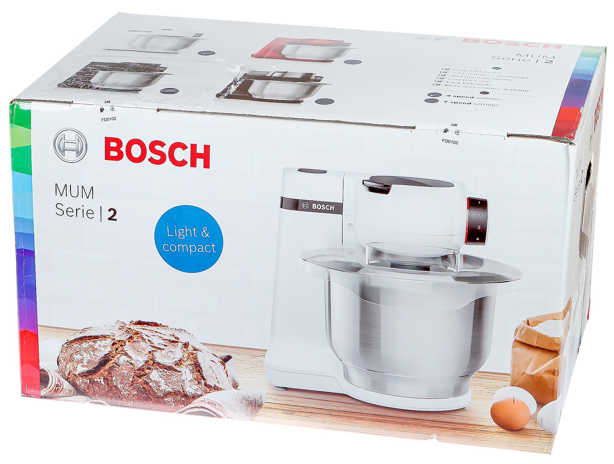 Прибор поставляется в большой картонной коробке, оснащенной для удобства переноски двумя вырезами в боковых сторонах. На упаковке белого цвета содержится практически вся информация, необходимая для первого знакомства, — фотографии устройства и его отдельных насадок, перечень дополнительных аксессуаров, совместимых с комбайном Bosch MUMS2EW40, а также технические характеристики и достоинства прибора.
