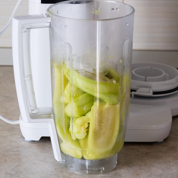 Отварили на пару́ три небольших кабачка, разрезанных вдоль. Никак их не измельчая, поместили ломтики в кувшин блендера прямо сразу из пароварки. Никакой дополнительной жидкости не добавляли.