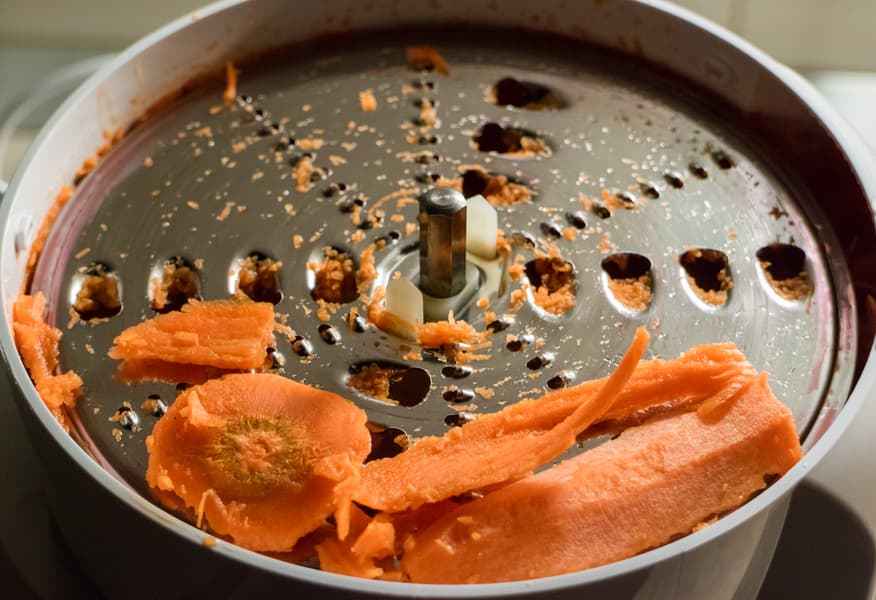 Морковь, даже самая крупная, без проблем помещается в загрузочное отверстие. 850 г продукта были натерты на мелкой терке двустороннего диска за 1 минуту 11 секунд. Работали на 3-й скорости.