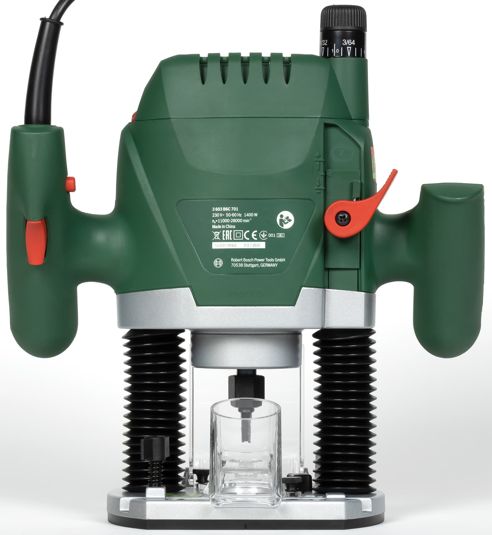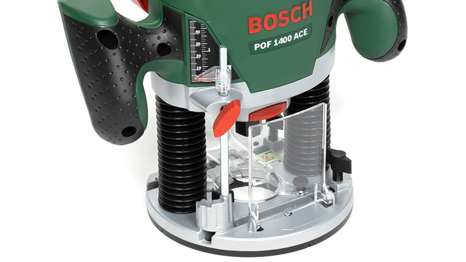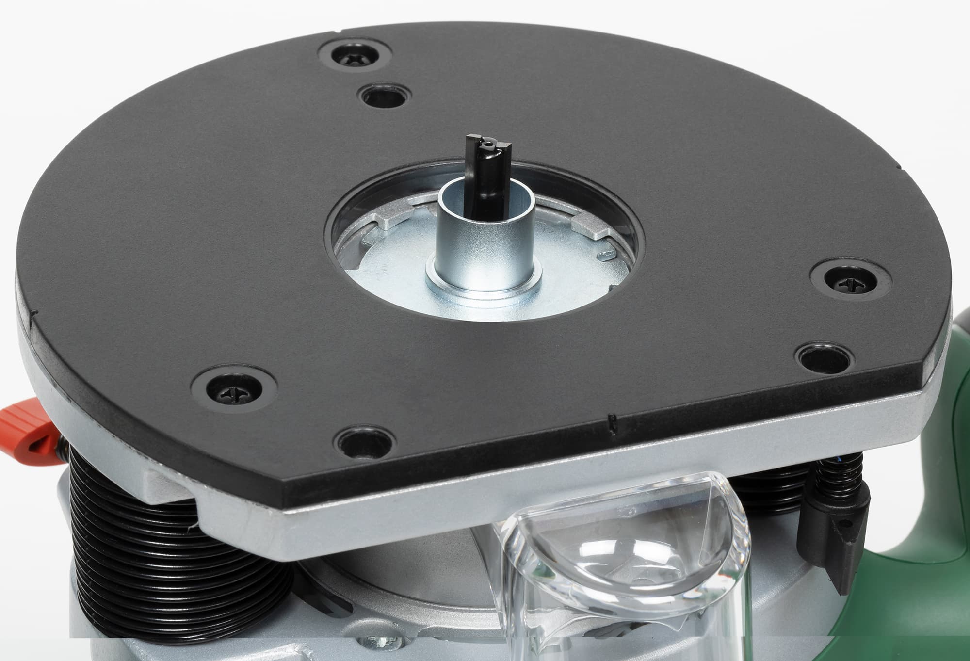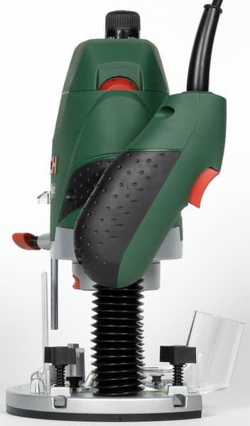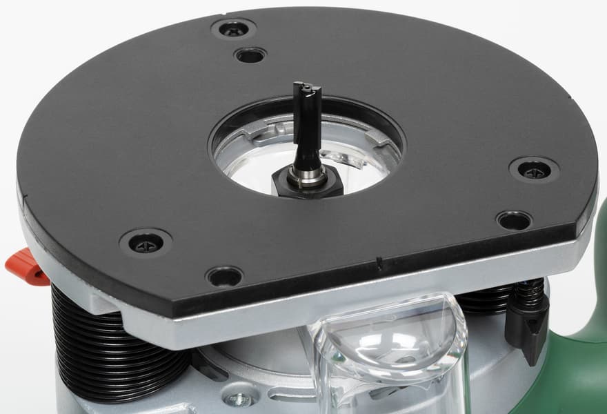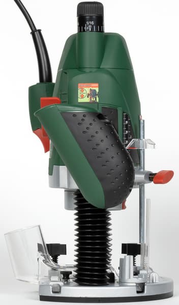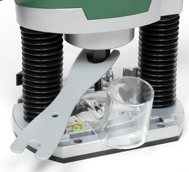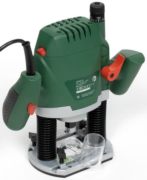 Максимальный диаметр фрезы, который можно использовать с данной машиной, составляет 50 мм, а глубина хода варьируется в пределах 55 мм. Комплектная съемная копировальная гильза (иначе — втулка) вставляется в подошву и фиксируется сдвижным подпружиненным рычагом.