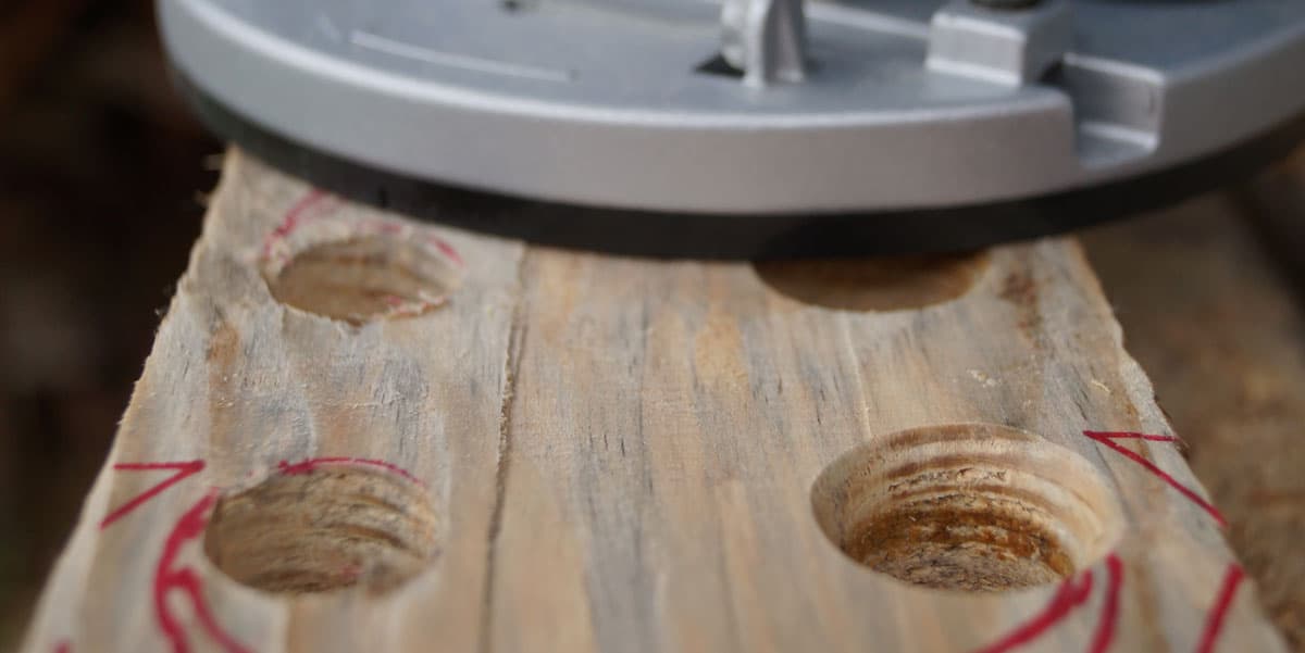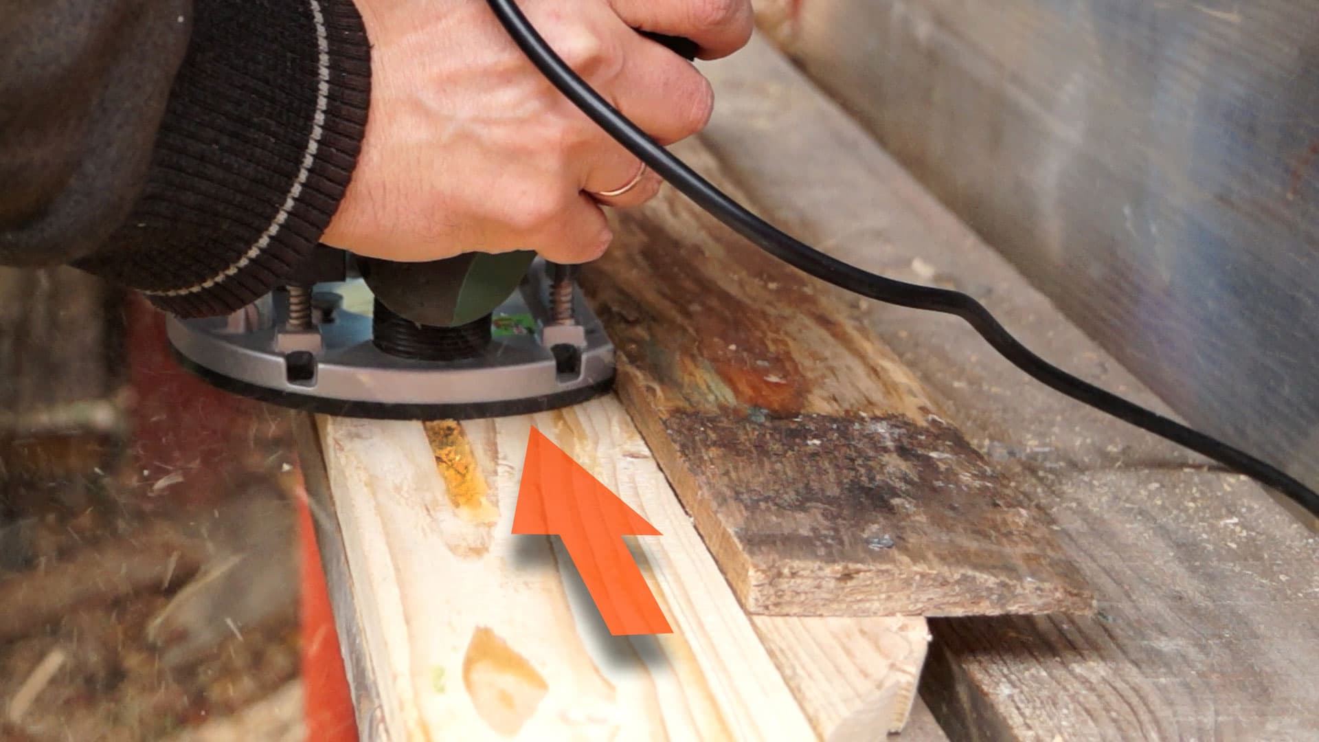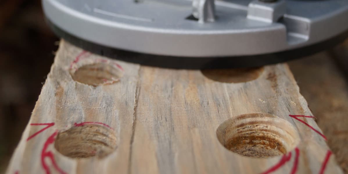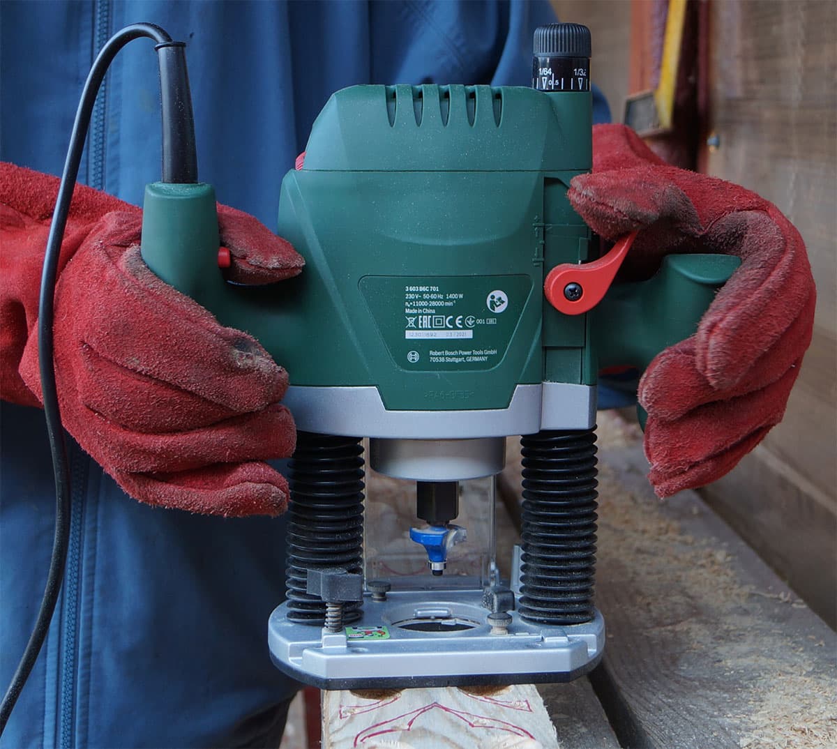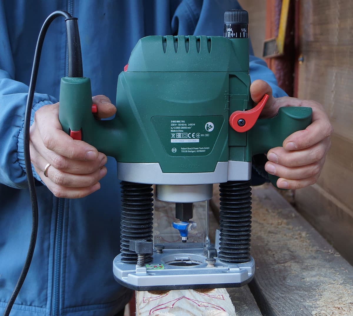 Вообще, главное при работе с фрезерной машиной — крепкие руки. Если какую-нибудь дрель не возбраняется держать одной рукой, то с фрезером такой фокус не пройдет. Взялся за рукоятки — лучше навалиться всем весом, иначе фрезу непременно уведет в сторону, даже если пользуешься жестким шаблоном или ведешь фрезер вдоль направляющей.