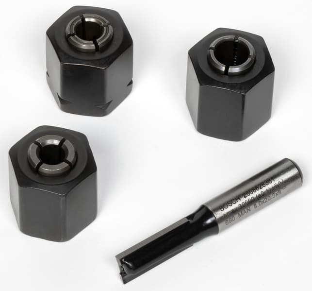 В комплекте с нашим фрезером имеется три зажимных цанги для установки фрез с диаметром хвостовика 6 мм, 8 мм и 1/4″. Простенькая 8-миллиметровая прямая пазовая фреза, имеющаяся в комплекте, позволит прорезать сквозное отверстие или вырезать углубление. Но не более.