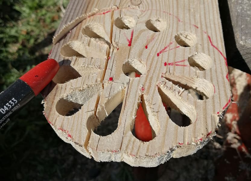 Слева — необработанные края отверстий, справа — обработанные. В чем плюс, где тут выигрыш? Во-первых, деталь остается прочной, так как диаметр отверстий увеличивается лишь на лицевой стороне, оставаясь небольшим по остальной глубине доски. Однако после покраски наличника обработанные отверстия визуально будут казаться крупнее, что как раз и требуется для большей выраженности узора. Ну а про «во-вторых» мы уже говорили: сглаженные края продлят жизнь дереву, поскольку меньше подвержены выветриванию.