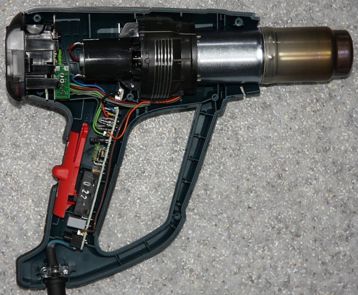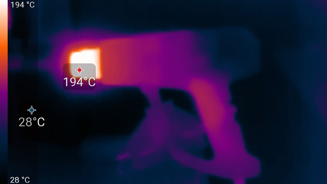 Это значимый нагрев в области передней части рукоятки (фен был зажат в тисках за скобу).