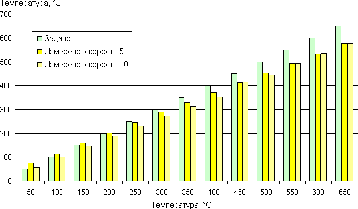 Видно, что в области низких температур измеренное значение может быть чуть выше заданного, тогда как по мере роста заданной температуры измеренная все больше занижается. Однако занижение в относительных величинах лишь немного больше заявленного отклонения в ±10%. С учетом точности измерения температуры (заявлено ±(1%+30)) реальная температура может быть еще ближе к заданной, чем измеренная. В случае промежуточных значений температур, то есть между заданными 50 и 650 °C, в установившемся режиме примерно с периодом в 2 с температура меняется от меньшего значения к большему, но размах изменения не превышает ±4 °C.