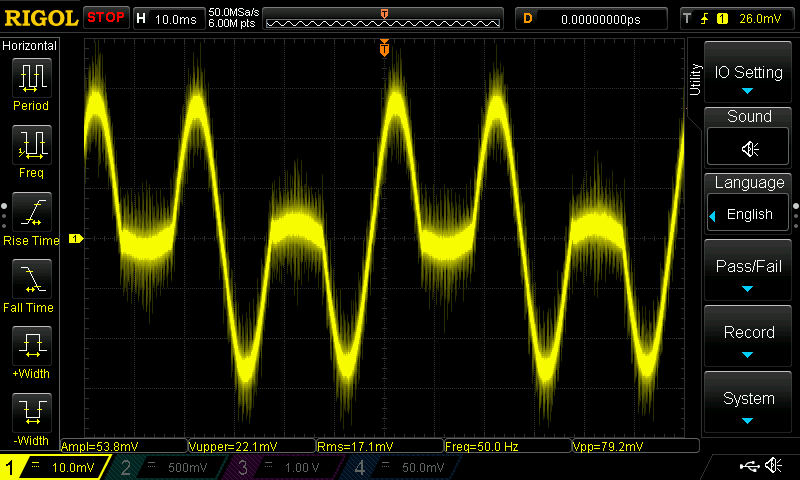 Осциллограммы напряжения на шунте ваттметра выявляют особенности работы нагревательного элемента. Вариантов всего четыре. Минимальный нагрев, постоянно включена маломощная секция нагревательного элемента (и работает вентилятор), мощная секция отключена, потребление порядка 200 Вт: