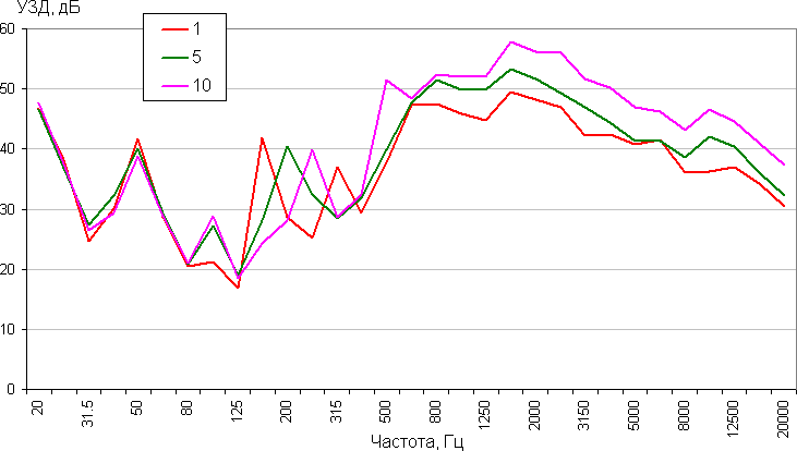 Согласно нашему житейскому опыту, данный фен шумит примерно так же, как типичные представители этого класса инструментов. Характер шума умеренно неприятный, кроме ровного шума воздуха есть выраженное жужжание. Посмотрим на АЧХ, которая получена с помощью шумомера при замере УЗД в интервалах по 1/3 октав: