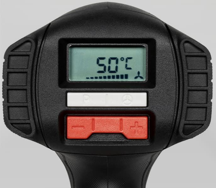 В этом фене можно регулировать как воздушный поток, так и температуру. Первое — от 150 до 500 л/мин с разбивкой на 10 ступеней, второе — от 50 до 650 °C с шагом в 10 °C. Особенно полезна точная настройка параметров в случае таких деликатных процессов, как сварка линолеума.