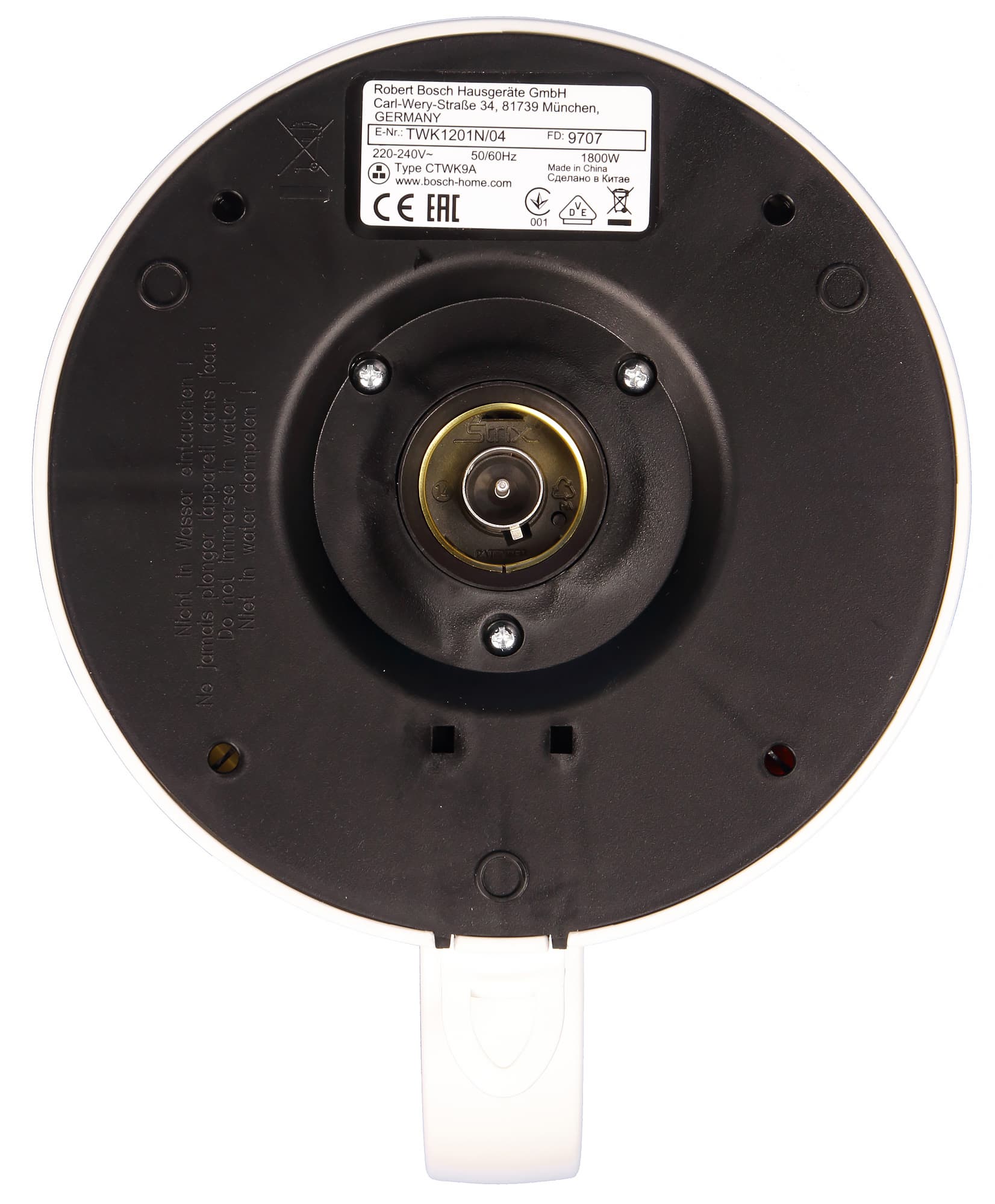 Крышка, ручка и основание чайника сделаны из белого глянцевого пластика. На основании можно увидеть красный логотип Bosch, красный индикатор работы и рычаг включения прибора со значками 0/I. Обращает на себя внимание тот факт, что для включения чайника рычажок нужно поднять вверх (а не опустить, как это принято у современных моделей).