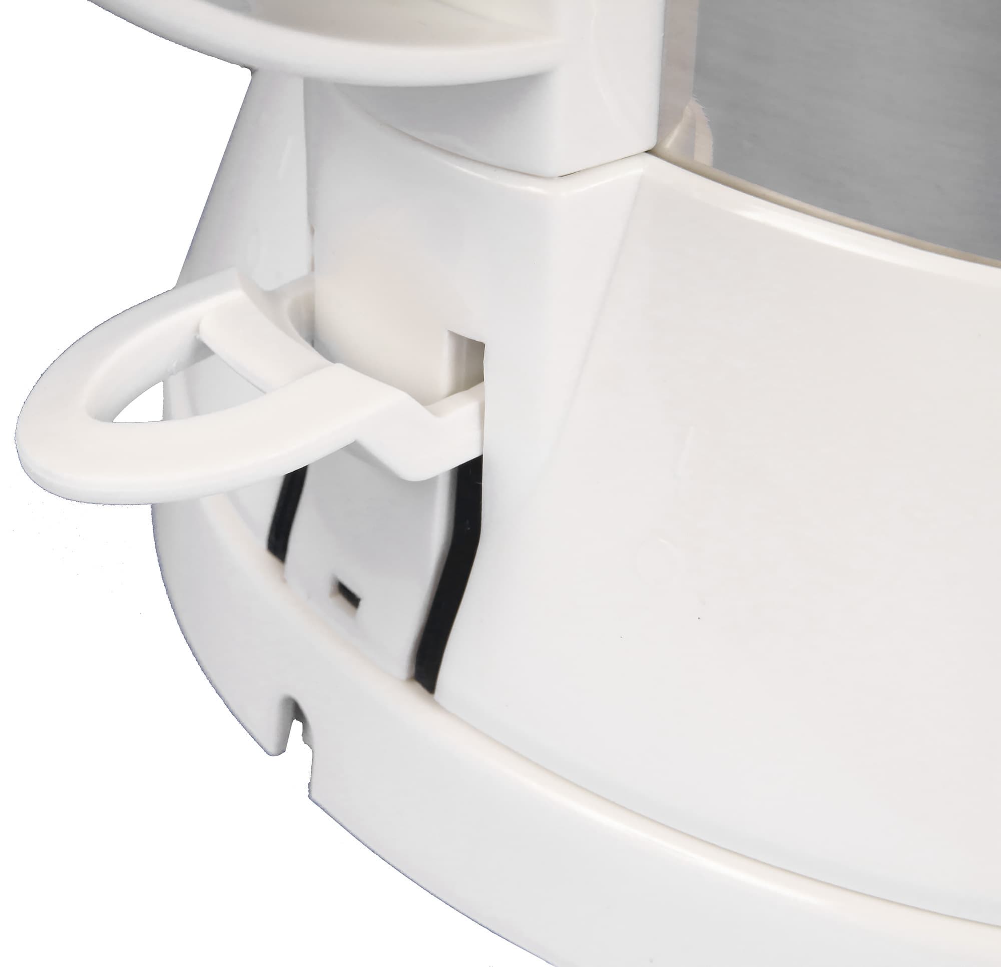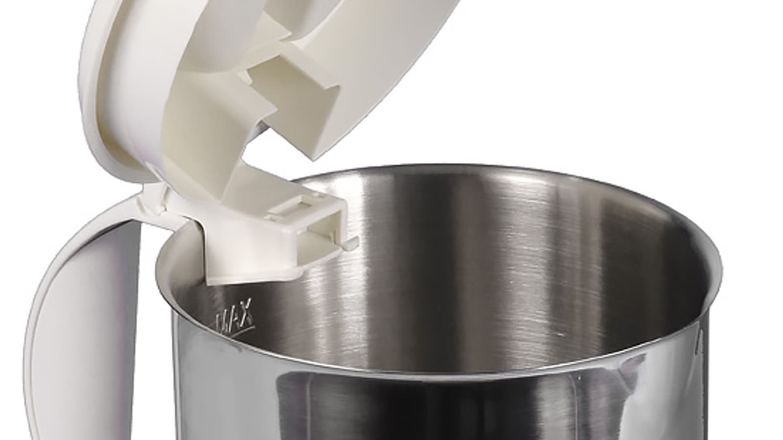 Несъемная крышка оснащена защелкой (она же — поперечная плашка, расположенная поперек крышки). Несмотря на качественный пластик, крышка может произвести впечатление болтающейся и хлипкой. Насколько это соответствует реальности, можно узнать лишь на собственном опыте (либо воспользовавшись опытом других пользователей). Изучив отзывы, мы выяснили, что крышка и в самом деле может сломаться (особенно при участии детей или при падении чайника), однако вряд ли это можно назвать массовой проблемой.
