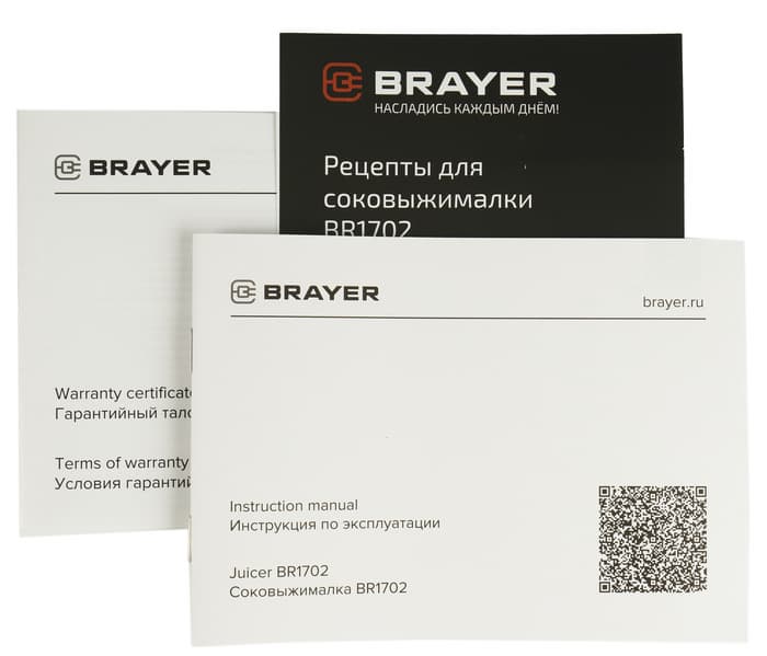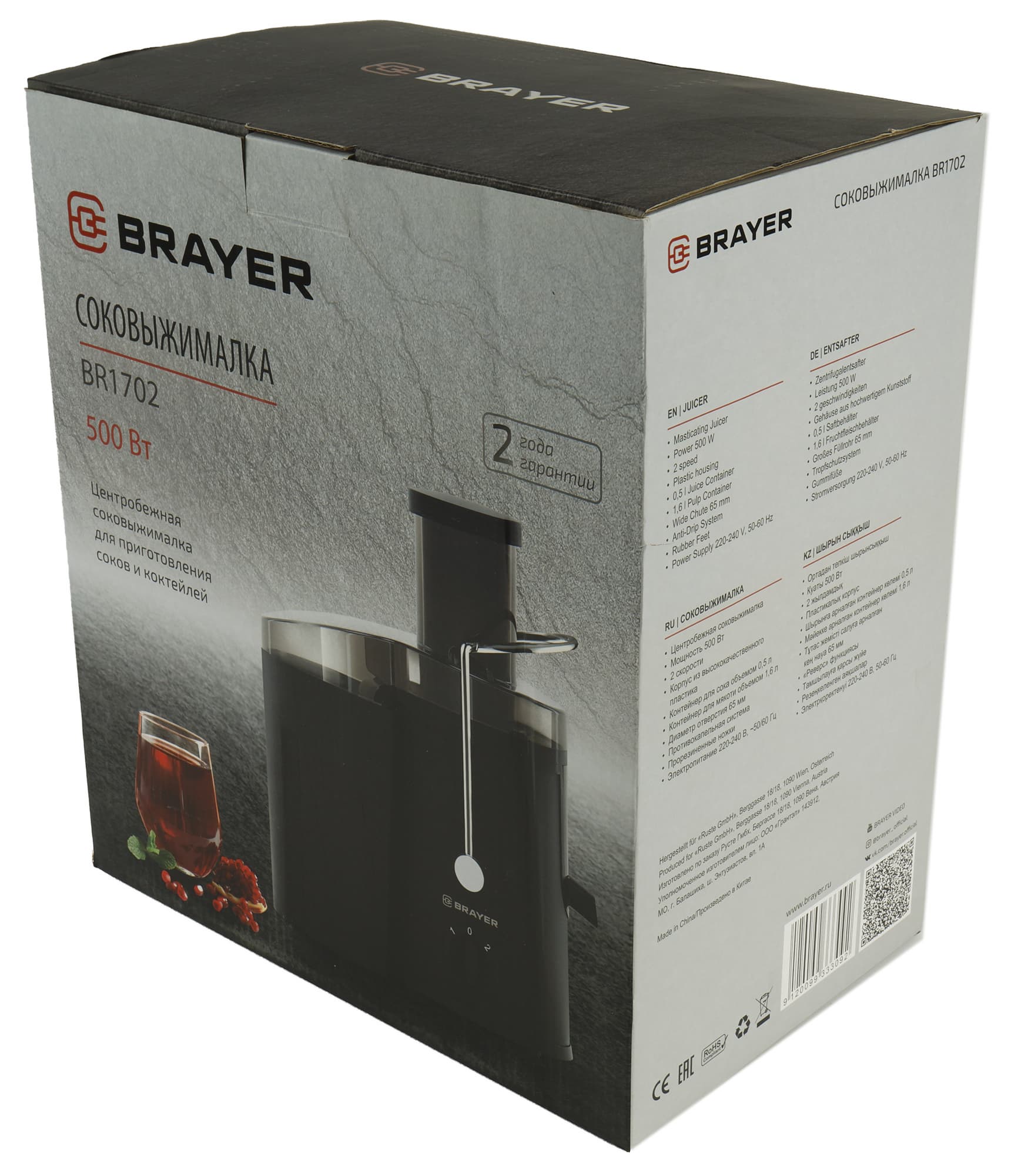 Brayer BR1702 пребыла на тестирование в аккуратной картонной коробке серого цвета. На центральной стенке, крупно — снимок соковыжималки в собранном виде, имя бренда, мощность и срок гарантии. На боковых панелях — основные характеристики на четырех языках, фотографии различных видов сока.