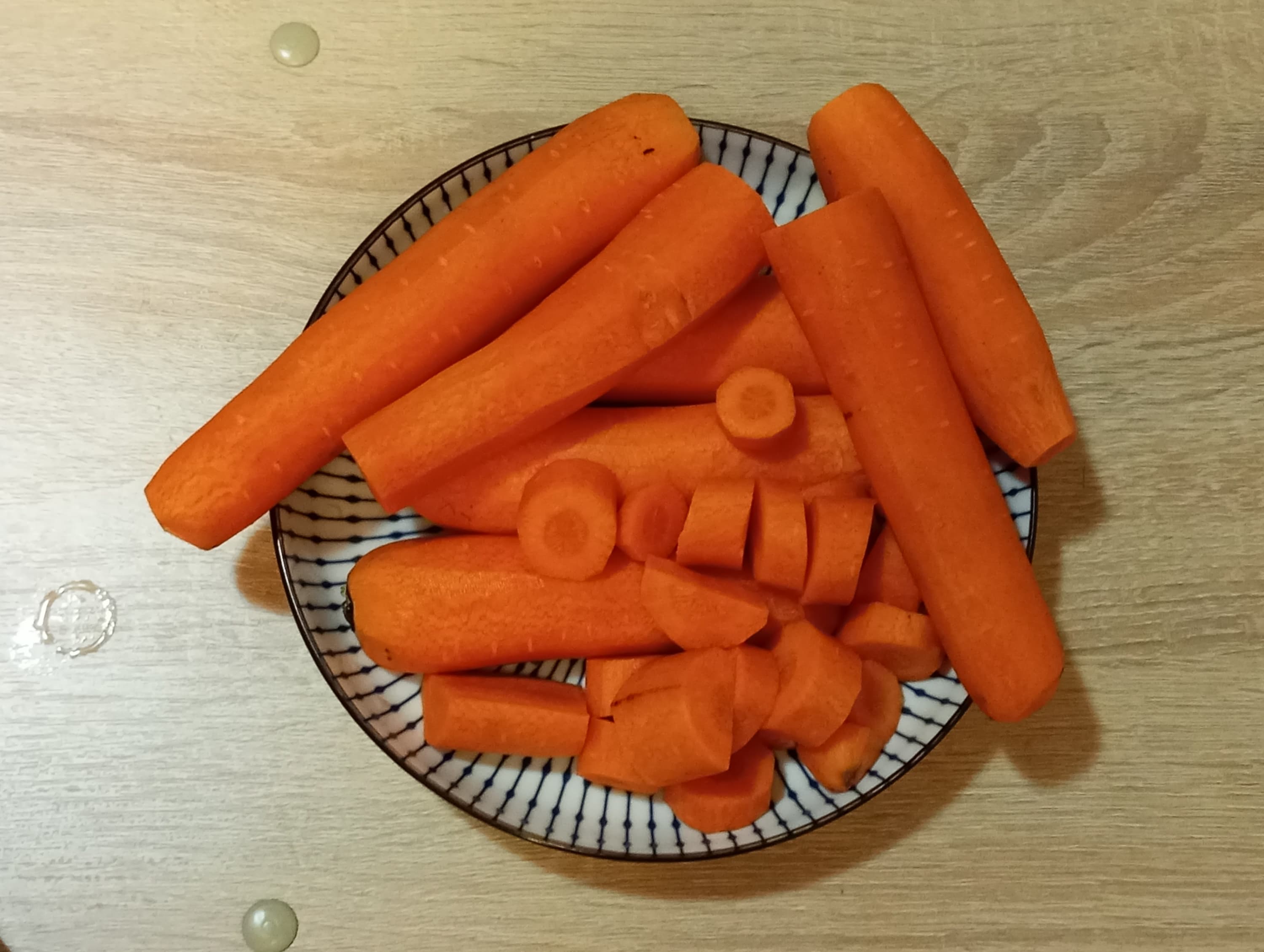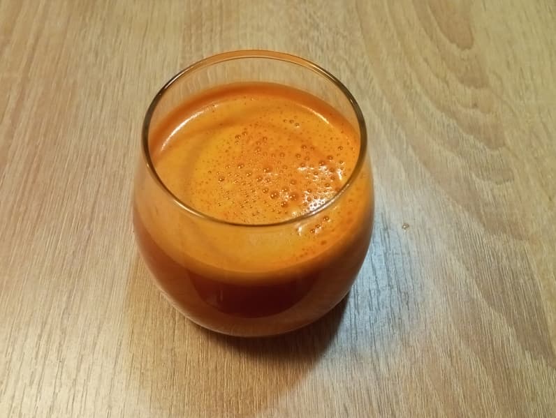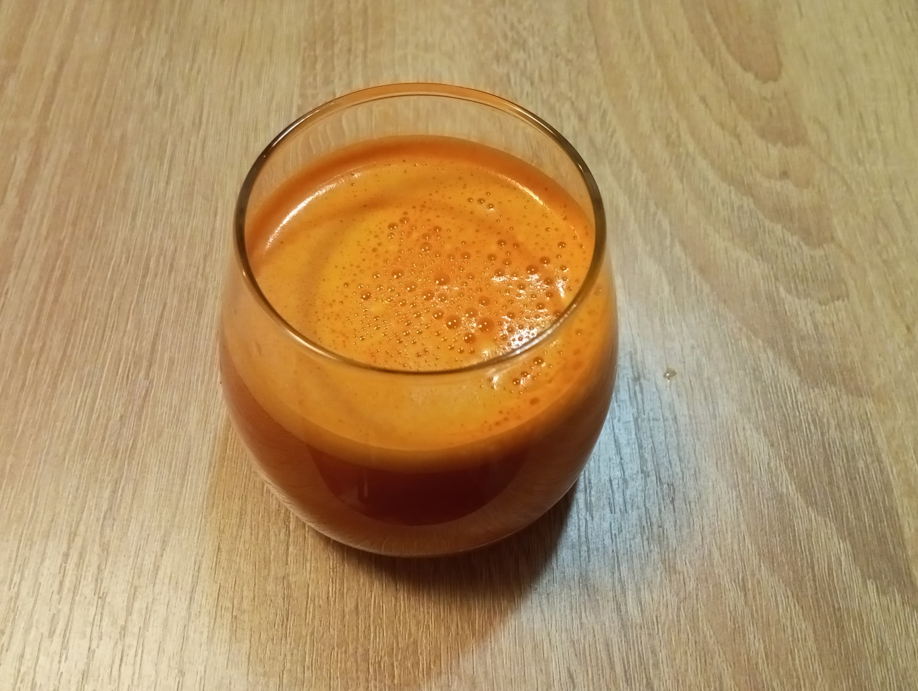 Морковь вымыли и порезали на небольшие кусочки, которые закладывали в горловину и придерживали толкателем. Этот тест проходил быстрее, жмых оказался однородный, очень мелкий и достаточно сухой. Пены было немного, а сок получился ярким по вкусу, мягким и очень вкусным.