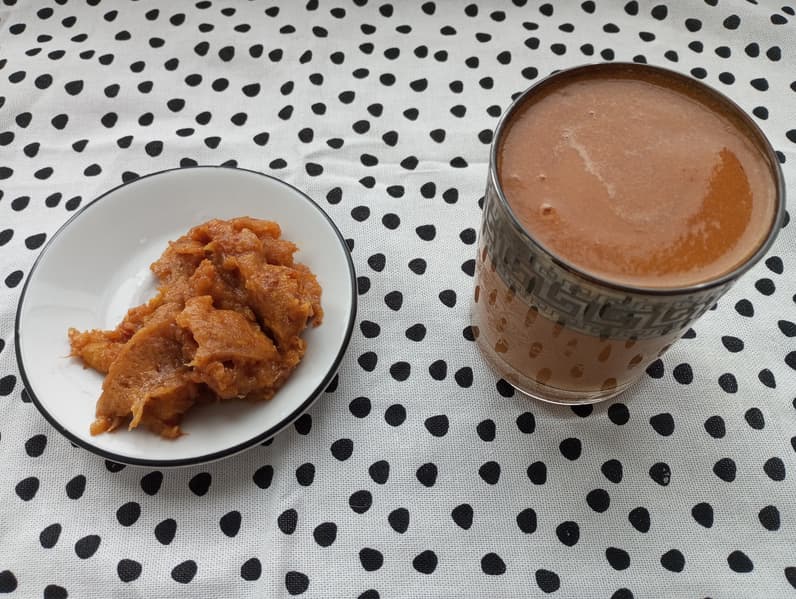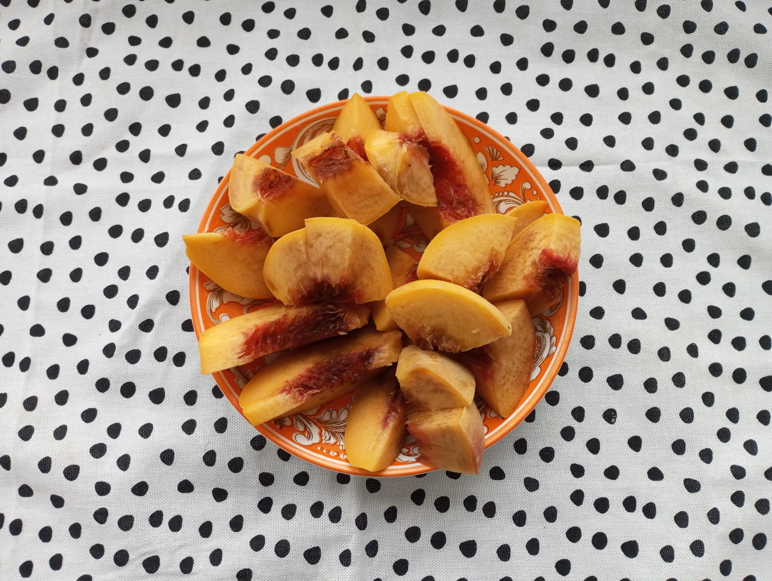 Вымыли, убрали косточки и порезали на грубые кусочки три крупных персика, около 400 г. На обработку ушло чуть больше 50 секунд, на выходе оказалось 220 г густого, с мякотью, приторно сладкого сока. Оставшийся жмых мы с удовольствием съели ложкой.