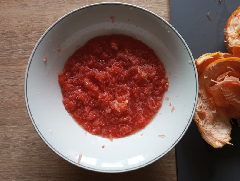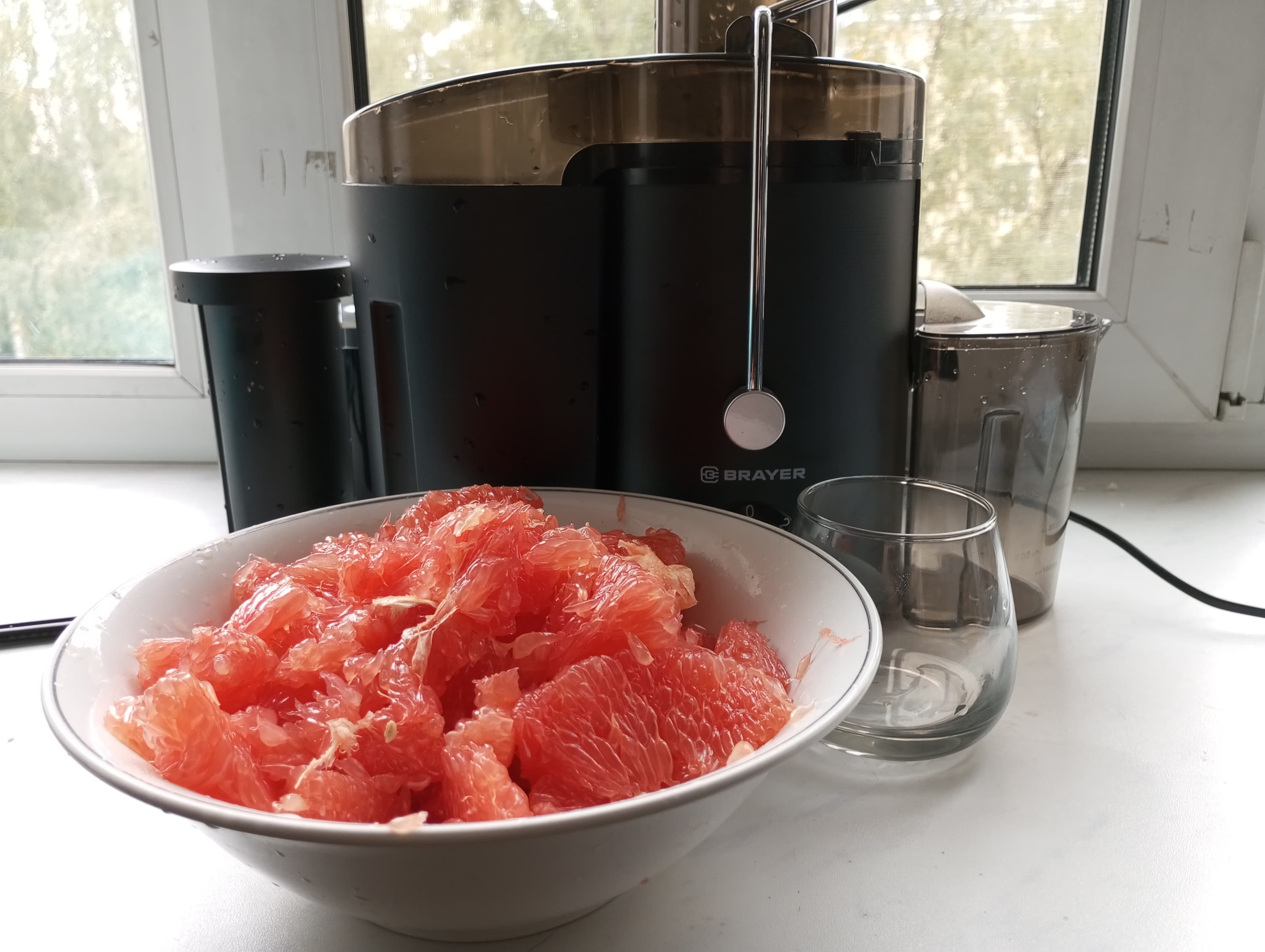 Мы очистили фрукт не только от кожуры, но и от пленки, в которой содержится основная горечь. В итоге больше времени ушло на очистку плода, чем на приготовление сока. На будущее: этой модели не обязательна такая тщательность, даже наоборот — мелкие дольки больше и чаще улетали в жмых. Которого, к слову, оказалось много, и он не был сухим. Зато сок получился фактически без пены, очень нежным, без мякоти и сильно насыщенным. Ему не хватило места в емкости для сока, пришлось отливать.