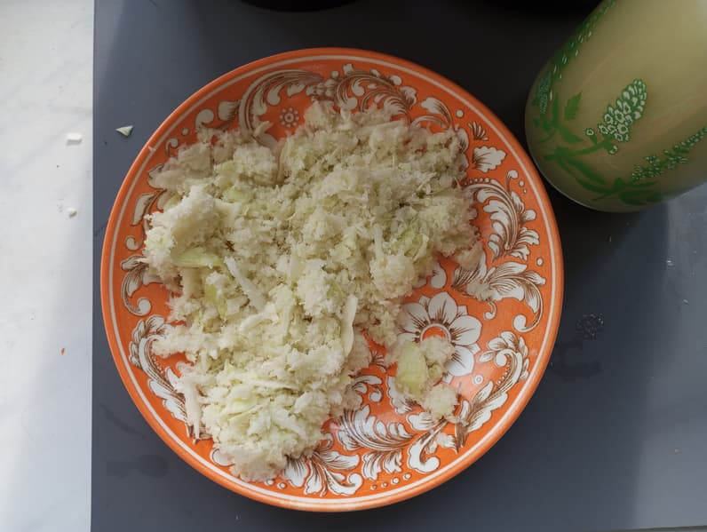 Капусту сполоснули, нарезали на среднего размера кусочки, которые закладывали в горловину и придавливали длинным толкателем. Жмых получился мелким и очень сухим, крупных кусочков листьев мы в нем не обнаружили. Наши надежды пустить жмых на начинку в пресный пирог не оправдались. Возможно, причина была в хорошем качестве самой капусты. Зато сок получился насыщенным, ярким по вкусу и очень сытным.