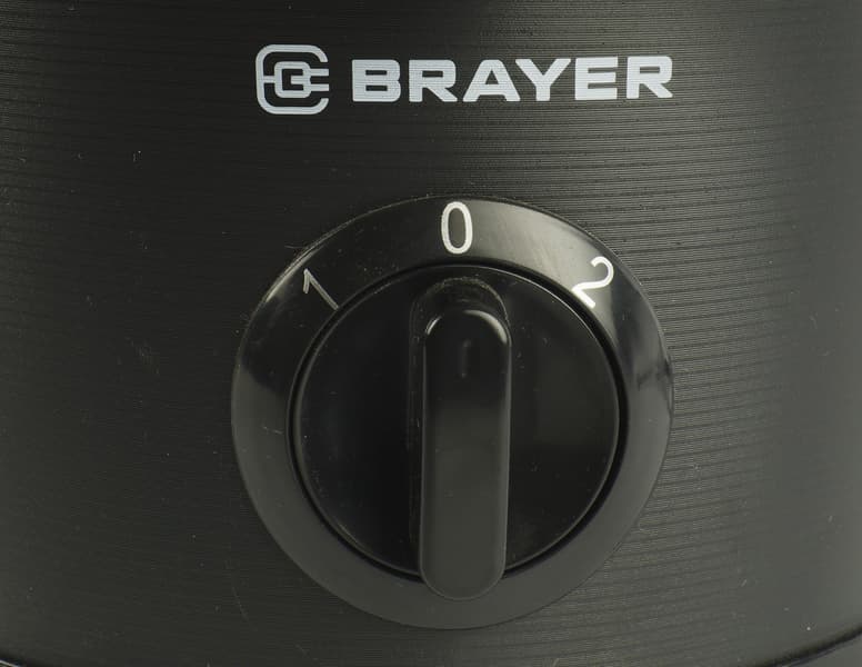 У Brayer BR1702 всё довольно стандартно: две скорости и один механический трехпозиционный переключатель. Первая скорость — низкая, вторая — максимальная, при переводе регулятора в положение 0 соковыжималка останавливает работу.