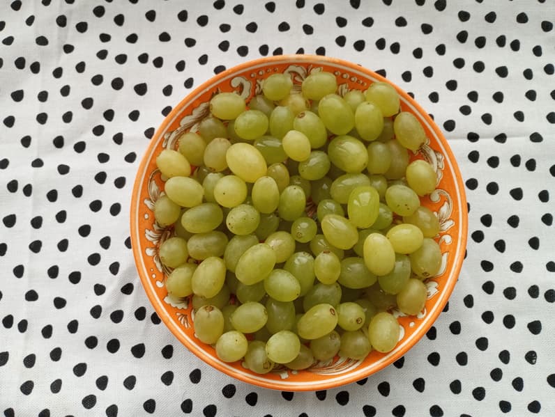 Мы взяли 400 г винограда без косточек, помыли, ягоды закидывали в горловину горстями и придерживали толкателем. На всё ушло около 40 секунд, на выходе получилось 245 г чистого, нежного и красивого сока. Жмых остался весьма мягким и сочным.