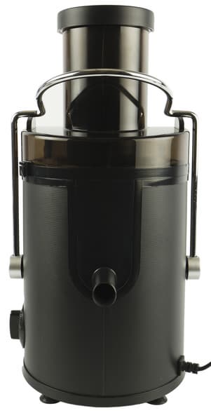 На самом деле, конструкция давно отработанная и весьма распространенная, причем речь идет не столько о прямом копировании, сколько об использовании определенной схемы компоновки прибора. Примерно «в этом же жанре» сделаны и Redmond RJ-M909, и Gastrorag HA-007, и некогда весьма популярная Steba Е160: цилиндрический корпус, по центру которого размещен загрузочный лоток, с левого бока к нему «пристегивается» внушительного объема контейнер для жмыха, контейнер и корпус имеют общую крышку, фиксирующуюся при помощи прижимной скобы, на правом боку корпуса находится носик, из которого вытекает сок, снизу — «крутилка»-переключатель скоростей. Просто, незамысловато, и главное — быстро и удобно разбирать и собирать.