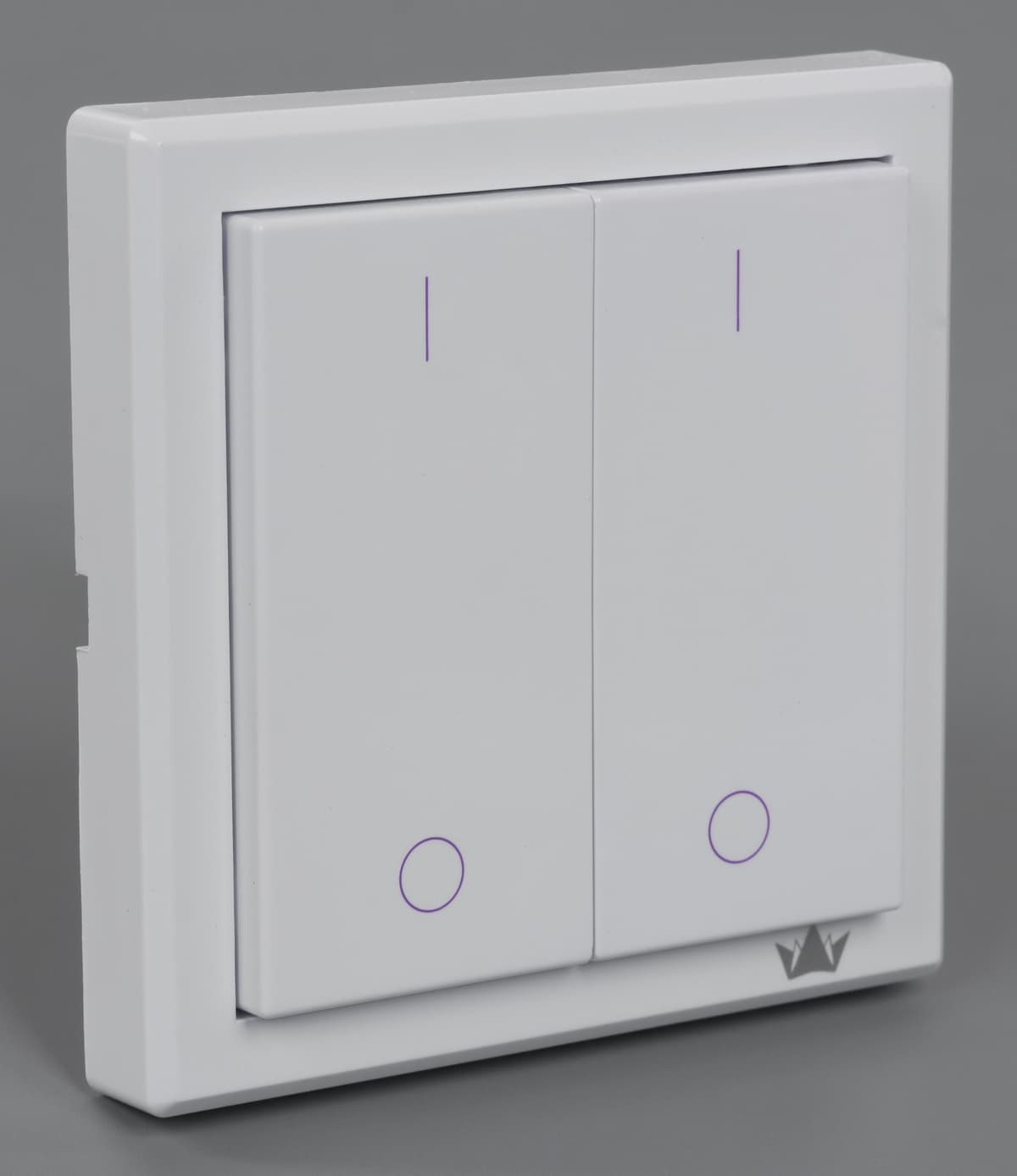 Для управления исполнительными устройствами могут использоваться не только датчики, но и классические настенные выключатели и компактные пульты. В качестве первых компания предлагает две модели — на один и на два канала, оформленные в трех разных цветовых вариантах. У нас на тестировании было устройство с парой двухпозиционных кнопок на два канала.