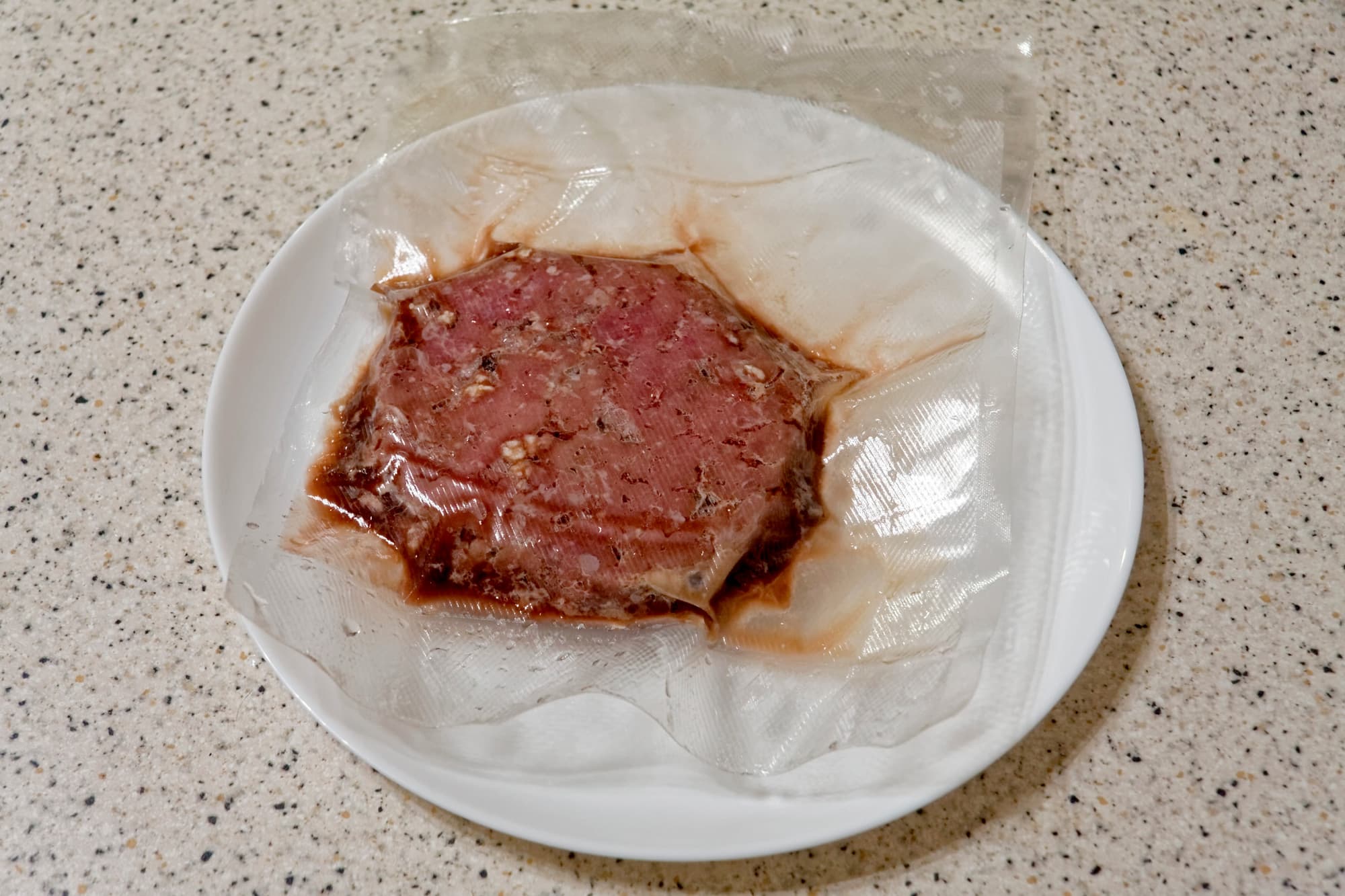 Тестируя погружной су-вид RawMid SVDM-01 (уже не продается, можно использовать любой, например Kitch Delvita или Inkbird ISV-100W), мы использовали как раз замороженные бургеры, упаковав их в вакуумные пакеты и поместив в горячую воду (выбрали среднюю степень прожарки, которая требует температуры в 54 °C). Для довольно толстых котлет весом более 200 г должно быть достаточно получаса. Мы добавили еще 30 минут с учетом того, что наши котлеты были заморожены, и не ошиблись: часа оказалось вполне достаточно.