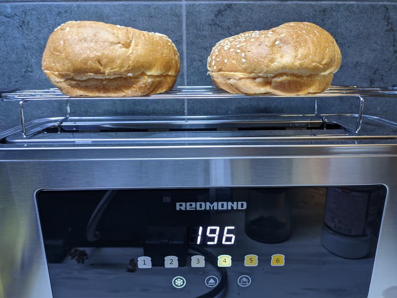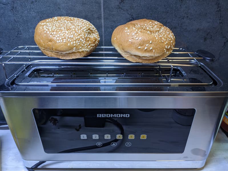 Когда-то мы и булочки для гамбургеров пекли самостоятельно, но всё же вечная нехватка времени и хороший выбор булочек (в том числе замороженных) в магазинах не способствуют таким кулинарным подвигам (разве что вафли сделали, но это другое). А вот размораживать булочки для бургеров нам нравится на решетке тостера. Например, так мы поступили, тестируя тостер Redmond T900 в режиме разморозки с 6 уровнями прожарки: то есть тостер сначала размораживает продукт, а потом немного обжаривает. Мы опробовали его на четвертом режиме и использовали решетку для подогрева выпечки, на которую и положили две замороженные булочки с кунжутом. Сначала тостер с одним длинным слотом показался нам не совсем удобным, но этот тест всё поставил на свои места: для булочек идеально. Конечно, можно и в духовке, и в СВЧ, но самый безопасный способ (нет риска сжечь, сделать мокрыми или пересушить) — на решетке тостера. На разморозку и подрумянивание булочек ушло 3 минуты 46 секунд. За это время они полностью разморозились, подогрелись снаружи и внутри, а снизу немного подрумянились.
