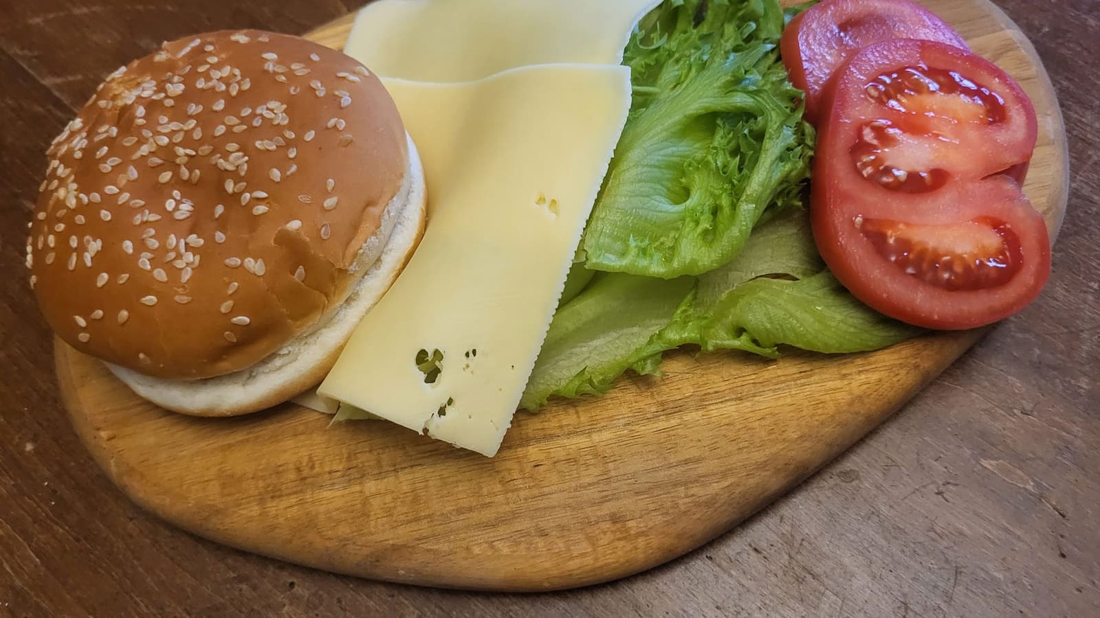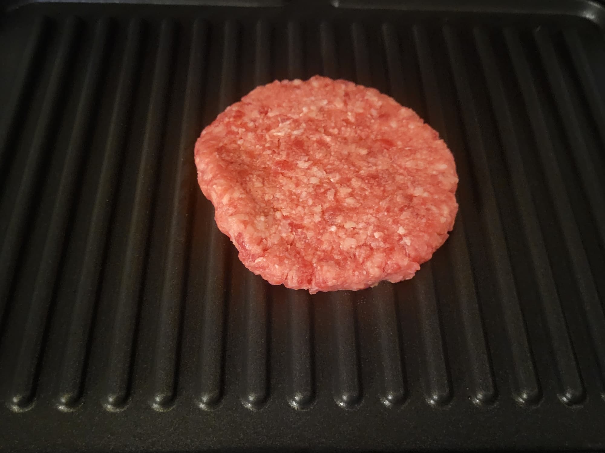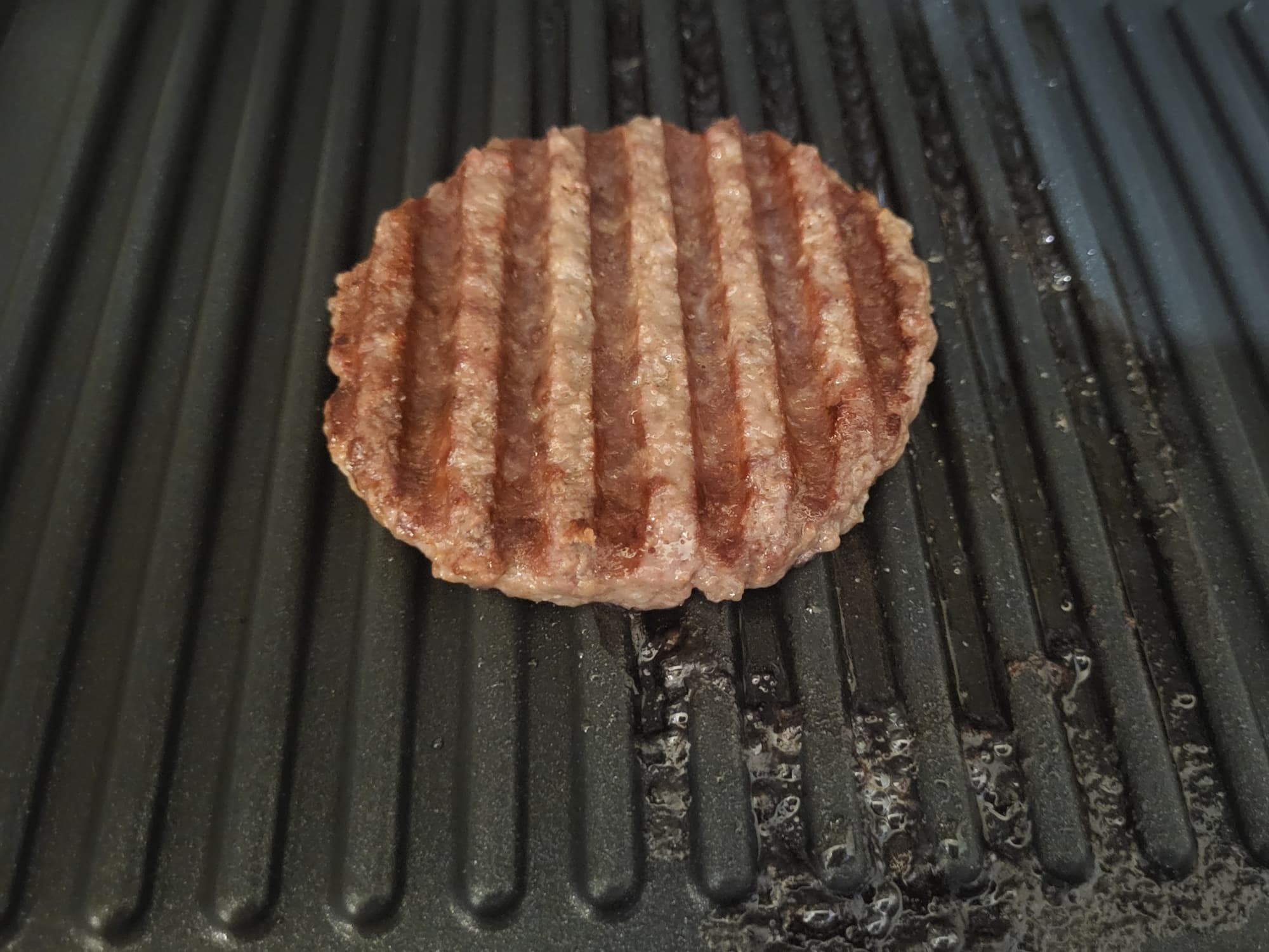 Тестируя небольшой бюджетный гриль Weissgauff WCG 250, мы готовили гамбургер следующим образом: взяли булочки для бургеров, взяли сыр, салат и помидор, подготовленную котлету положили на нижнюю пластину гриля, закрыли его, выставили автоматический режим для стейка и выключили через 4,5 минуты, поскольку увидели, что котлета поджарилась (специального режима для котлет нет, а рубленое мясо готовится быстрее стейка, для которого авторежим в этом гриле отводит 10 минут). Перевернули котлету, чтобы увидеть результат воздействия нижней нагревательной панели (видно на фото).