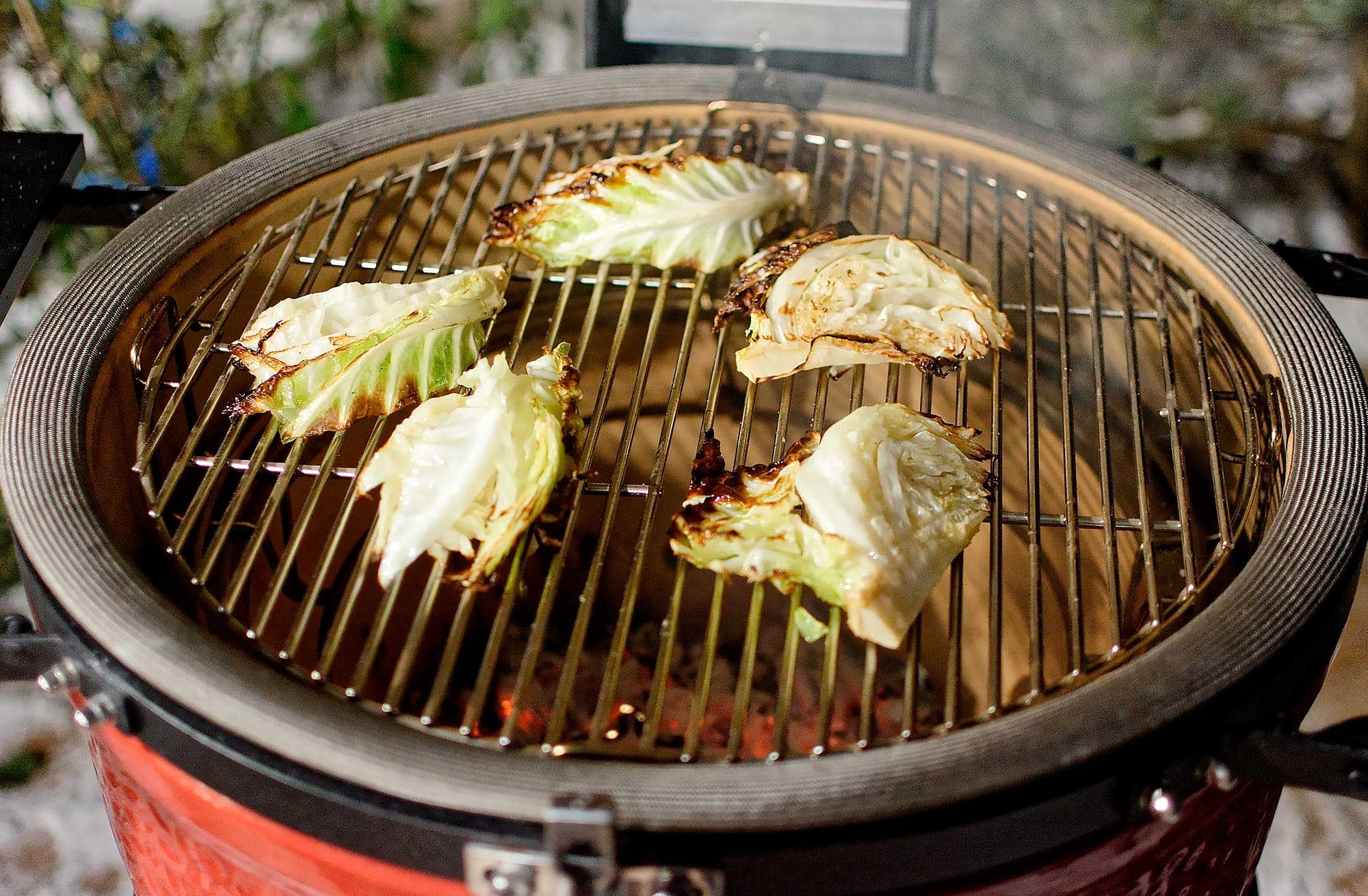 Неожиданно прекрасное блюдо, которое за считанные минуты готовится на горячем гриле. Молодую капусту нарезали секторами, посолили и сбрызнули края растительным маслом.