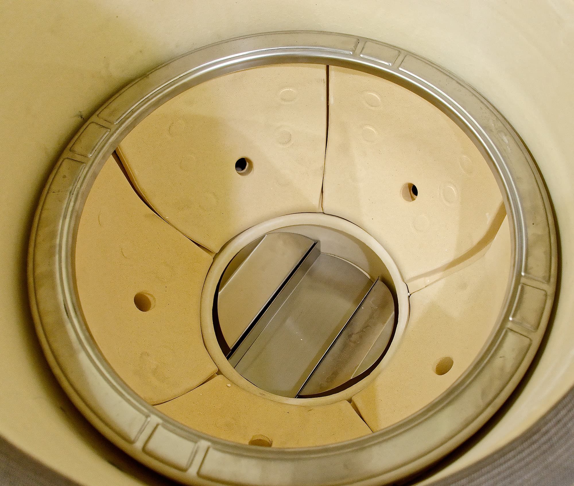 Керамический жароотсекатель — продвинутого типа: с разделением на две равные части. Благодаря этому можно сделать так, что работать он будет только на половину гриля и готовящихся в нем продуктов. А вот использовать его в качестве камня для пиццы уже не получится...