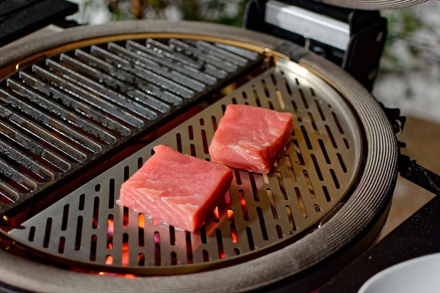 На разогретую стальную решетку для рыбы мы положили подсоленное и чуть смазанное маслом филе тунца и стали ждать.