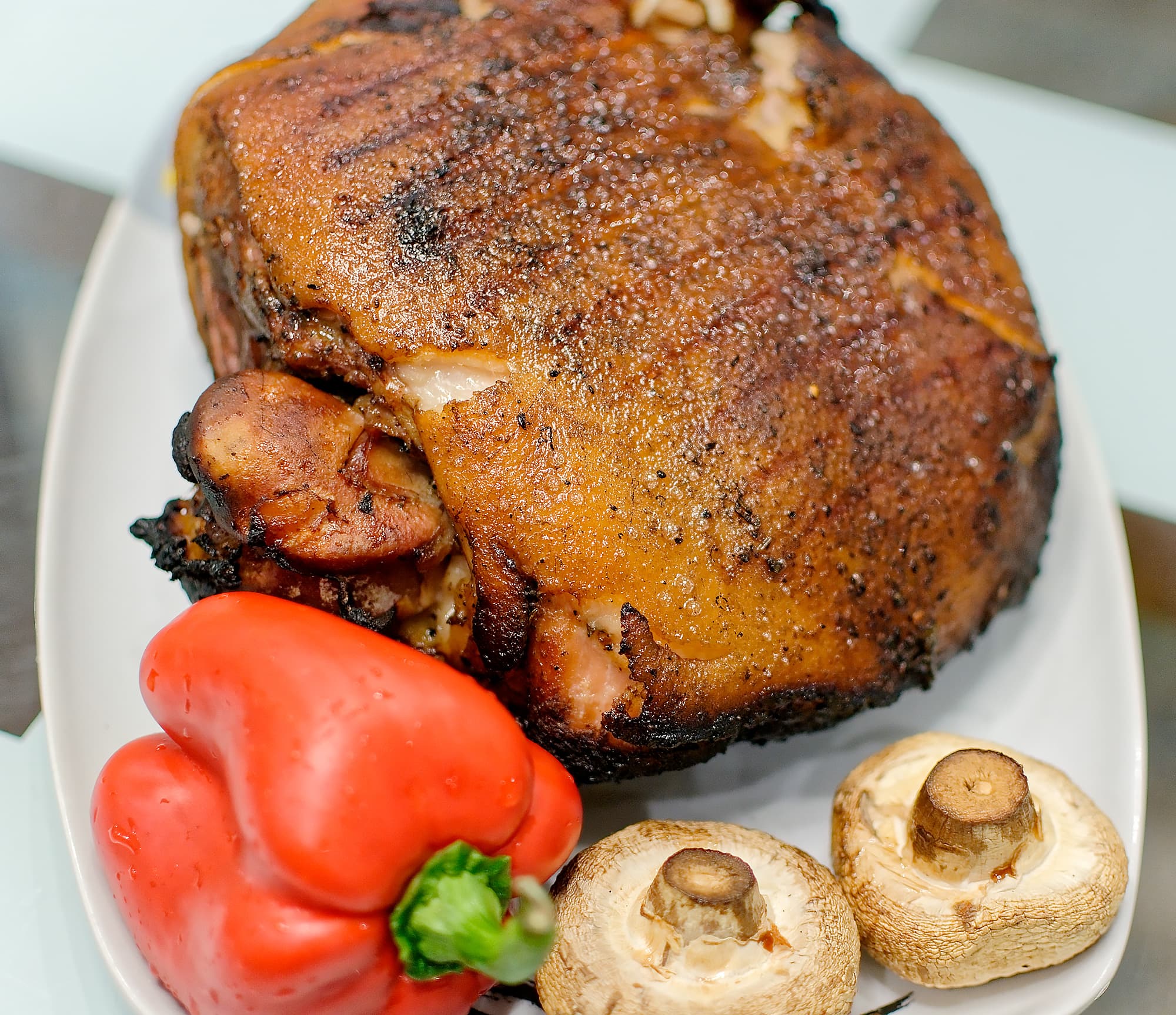 Под конец работаем на сверхнизких температурах. Мы долго регулировали все заслонки, стараясь добиться самого минимума внутри гриля. Внутри гриля мы держали заранее замоченную в соли, специях и яблочном соке бедренную часть молодого поросенка всего 4 часа, потому что до этого несколько часов продержали его в су-виде на температуре 70 градусов. (Отрицательные температуры «за бортом» заставляли задуматься об оптимизации процесса по времени: это вам не Калифорния!)