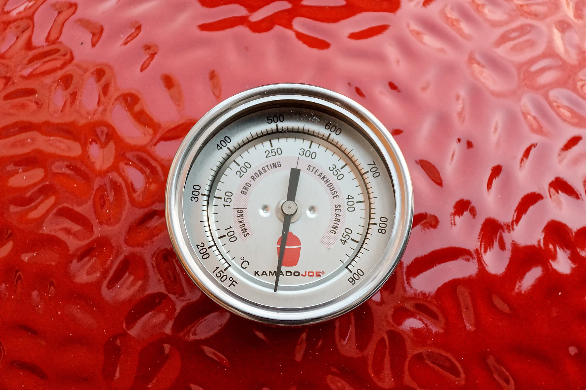 Внутренний термометр показывает, что тепло быстро улетучивается при каждом открытии крышки, но затем так же быстро и набирается: угли жаркие, тяга в мороз хорошая, керамика толстая.