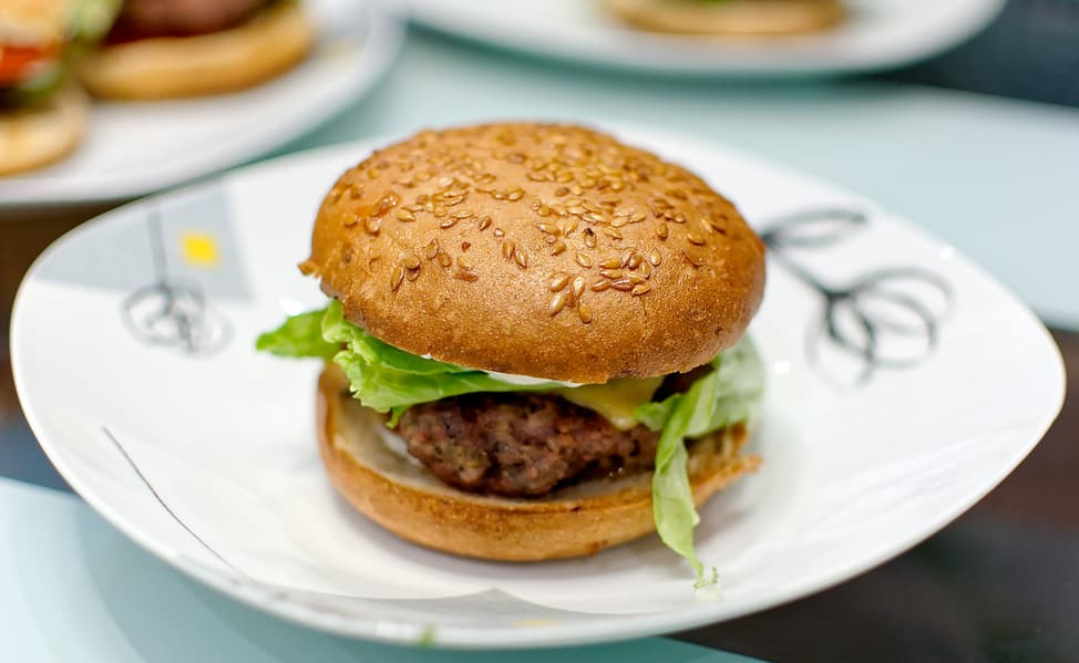 Салатный лист, помидоры, крымский лук, соусы на выбор — и великолепные, сочные котлеты совершенно неземного вкуса.