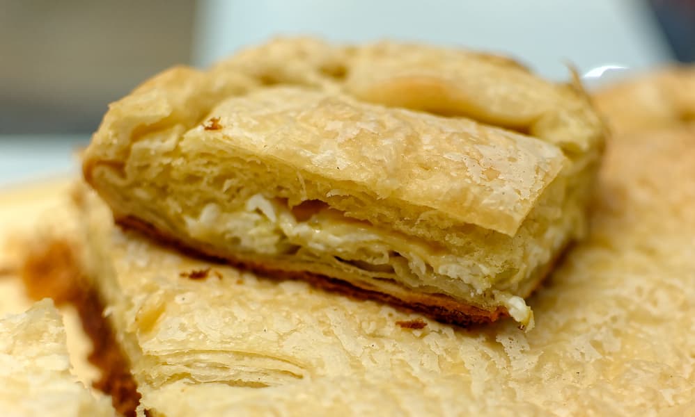 Продолжаем использовать гриль с рассекателем в качестве духовки. Пирог? Почему нет. Мы взяли слоеное тесто (покупное, но хорошего качества, главное — без маргарина в составе), раскатали нижний пласт и уложили в фольгированный противень. Сверху поместили две больших горсти тертого адыгейского сыра и одну — твердого. Выдавили в сырную начинку пару зубчиков чеснока.