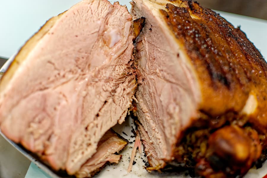 В общем, не то чтобы это был какой-то сложный эксперимент, просто на улице было так холодно, что мы не рискнули «мутить» полный цикл медленного томления в гриле. Однако результат получился вполне репрезентативным: мы поняли, что яблочный маринад великолепен, а готовить таким образом можно независимо от комбинации времени су-вид/гриль: в данном случае примерно пополам, а можно и целиком в гриле (за 4 часа стало абсолютно ясно, что температуру в мороз наше яйцо держит хорошо). В случае необходимости быстро подать блюдо на стол, можно оставить на гриль всего полтора-два часа, окорок успеет набраться духа и аромата, необходимого для совершенства.