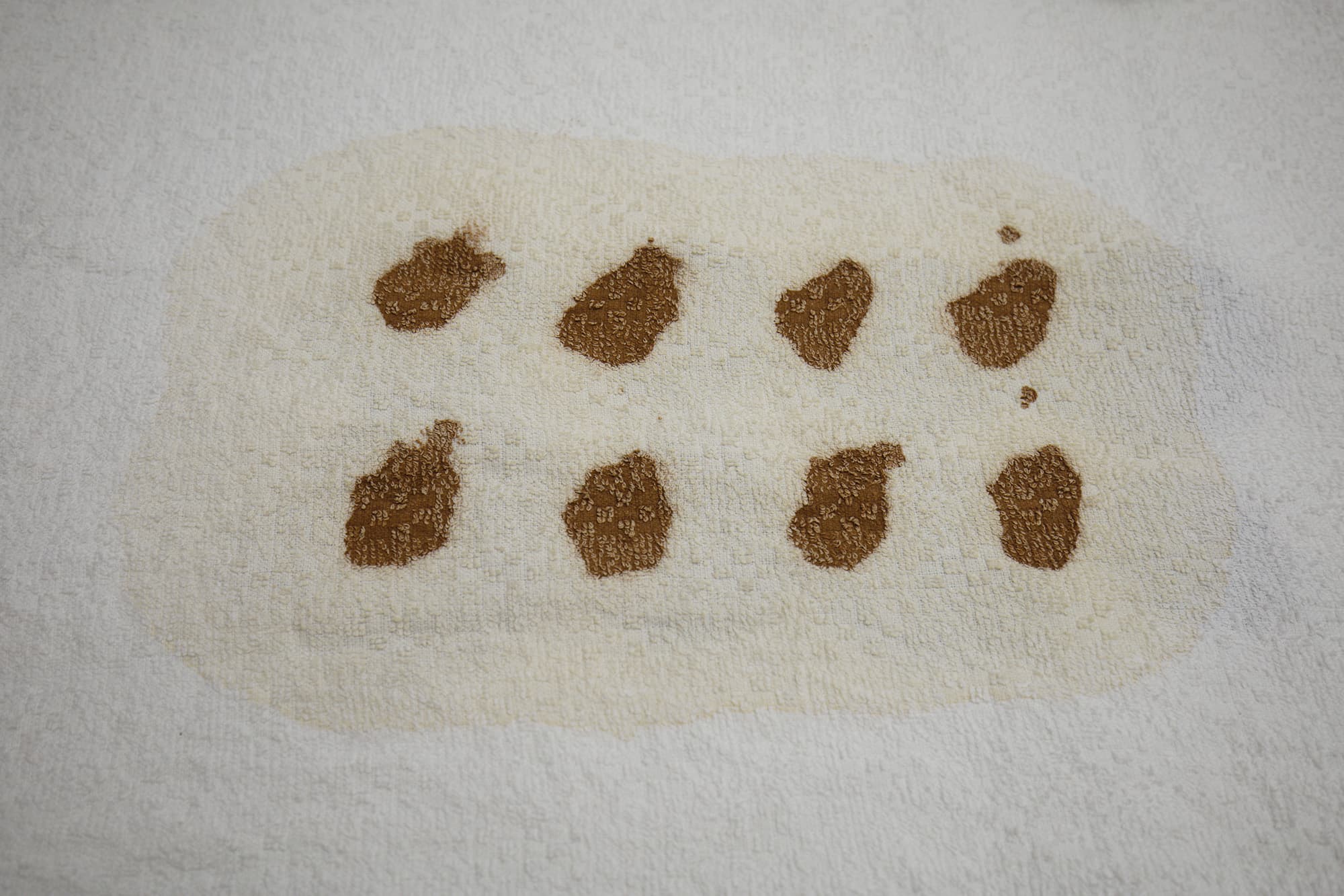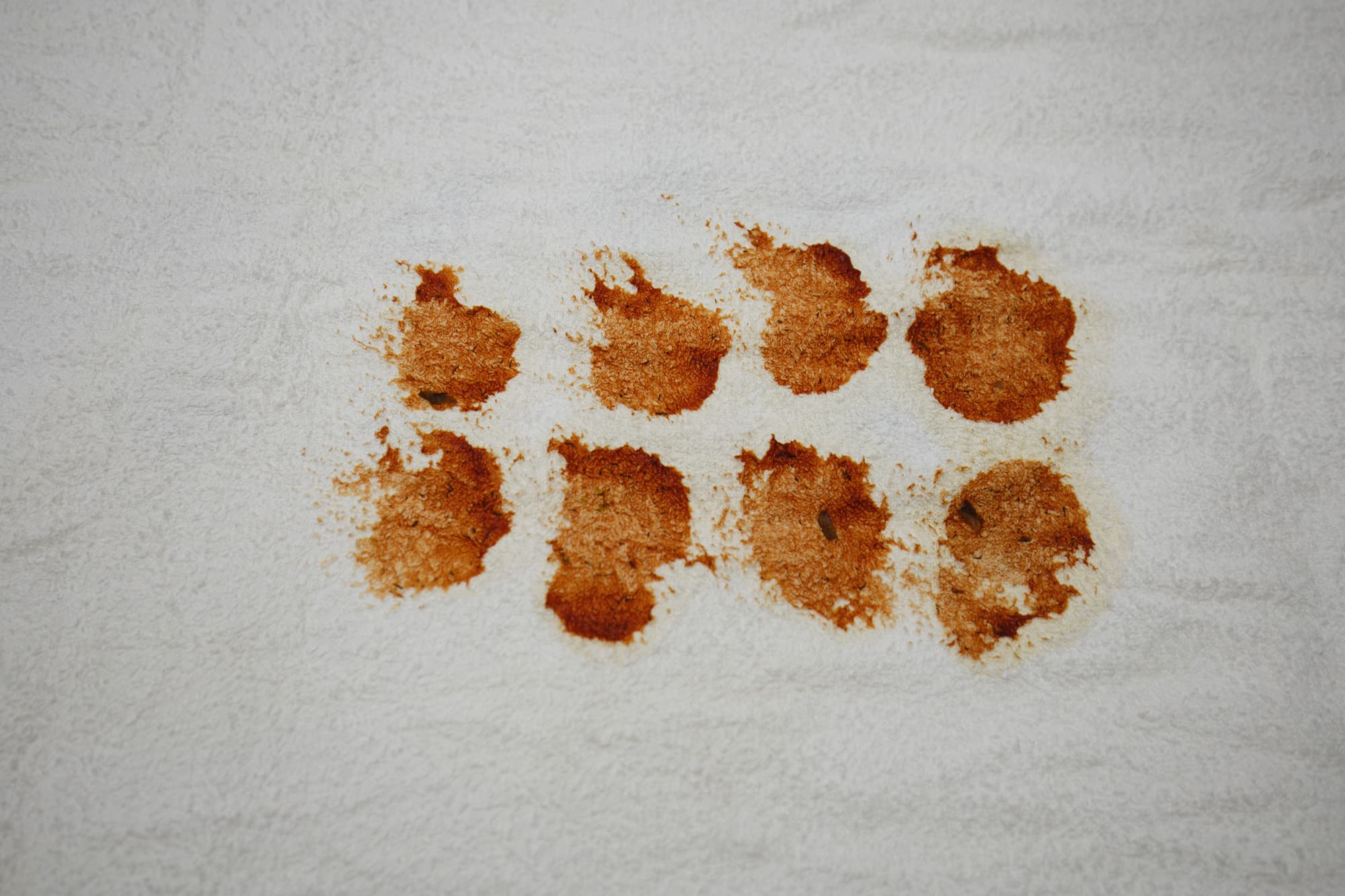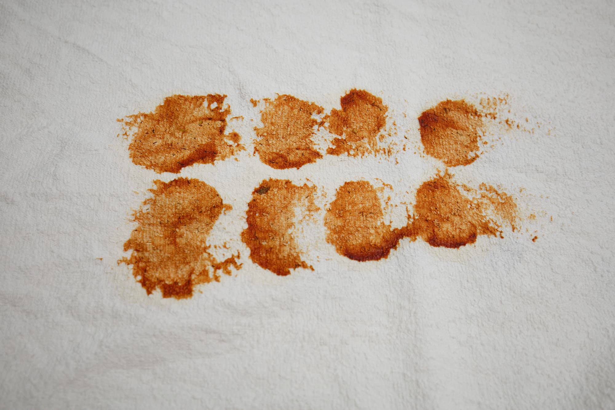 На комплект из пяти полотенец мы от души плеснули красного вина, соевого соуса, кетчупа, растительного масла, крови и какао (на каждом полотенце свое вещество). Загрязнения высушили при комнатной температуре в течение суток, после чего загрузили тестовую стирку.