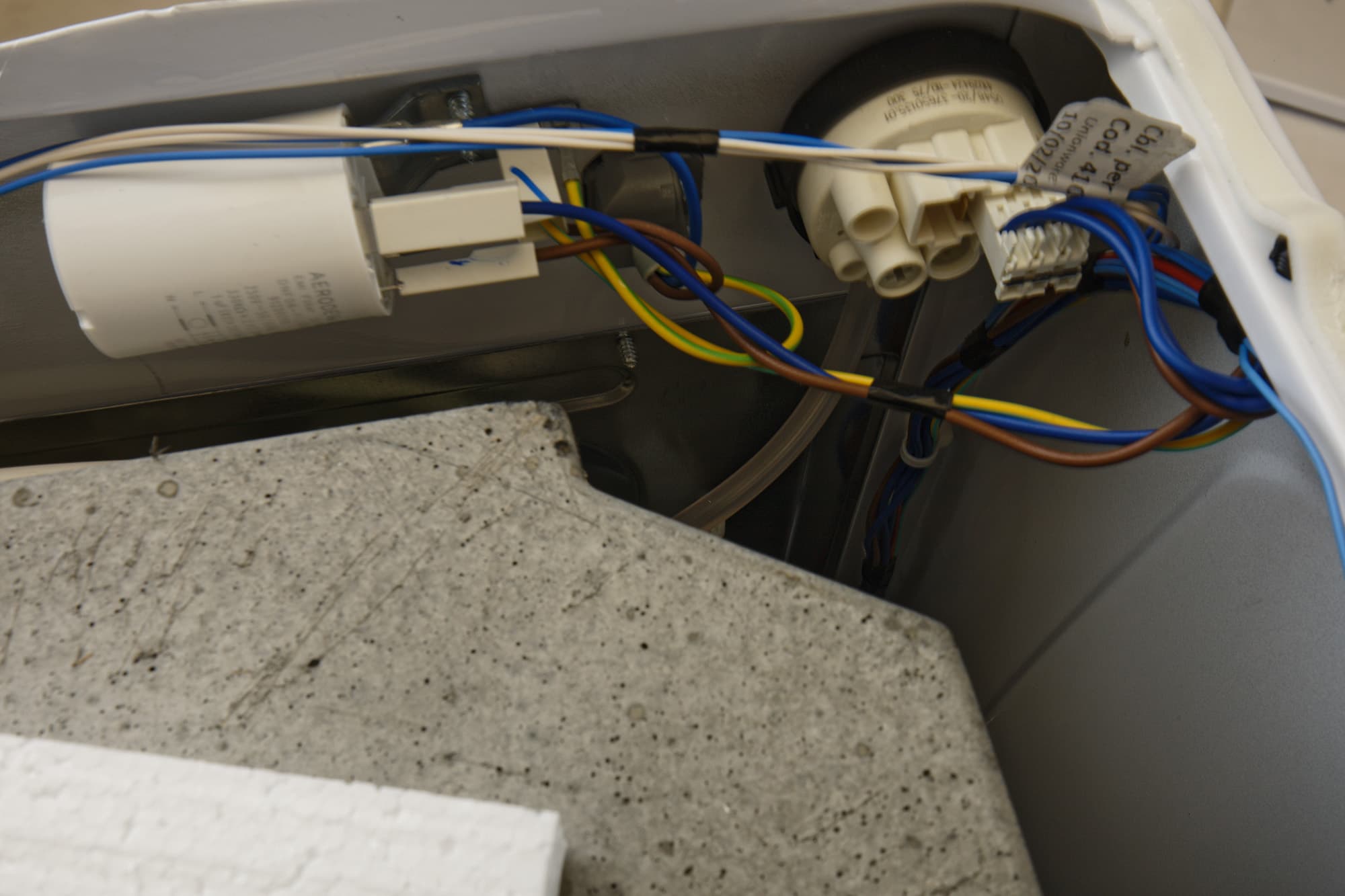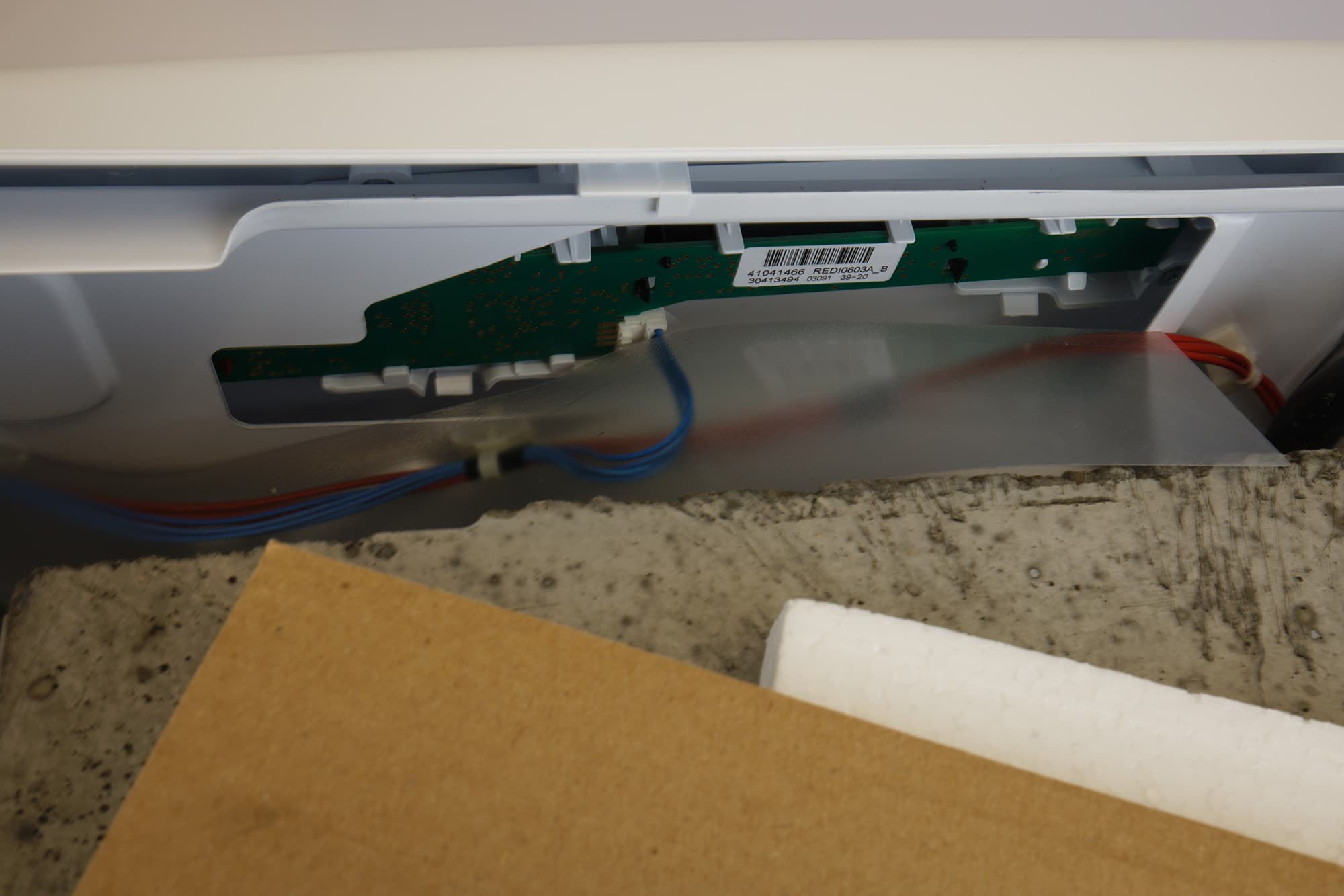 По уже сложившейся традиции мы производим неполную разборку агрегата и смотрим, что у него внутри. Снимаем верхнюю крышку (у этой модели, в отличие от большинства знакомых нам стиралок, она сделана не из пластика или ДСП, а из стали) и видим явно чужеродный элемент.