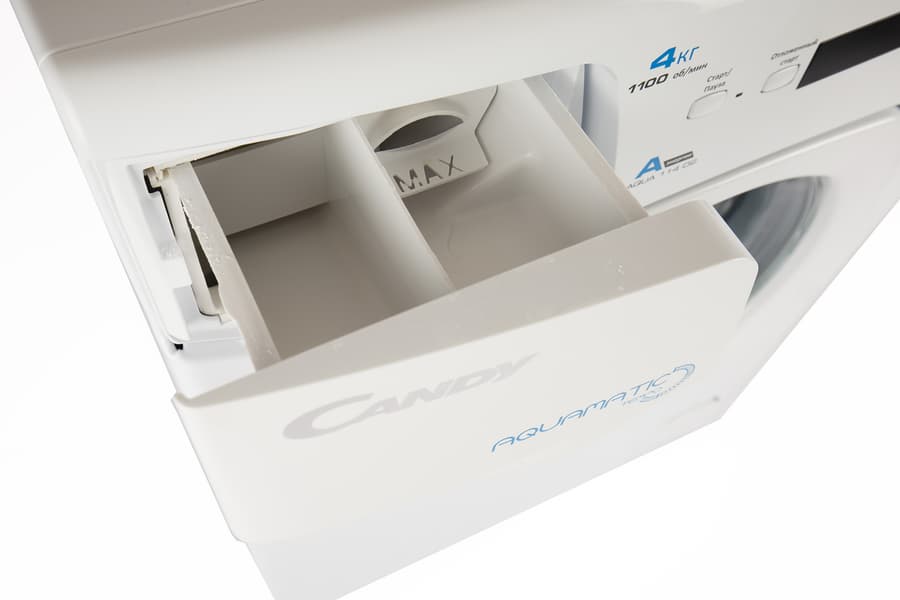 Отсек для моющих средств разделен на две части: одна половина — для стирального порошка или геля, вторая — для ополаскивателя. Опции предварительной стирки у Candy Aqua 114D2-07 нет, так что третий отсек не требуется.