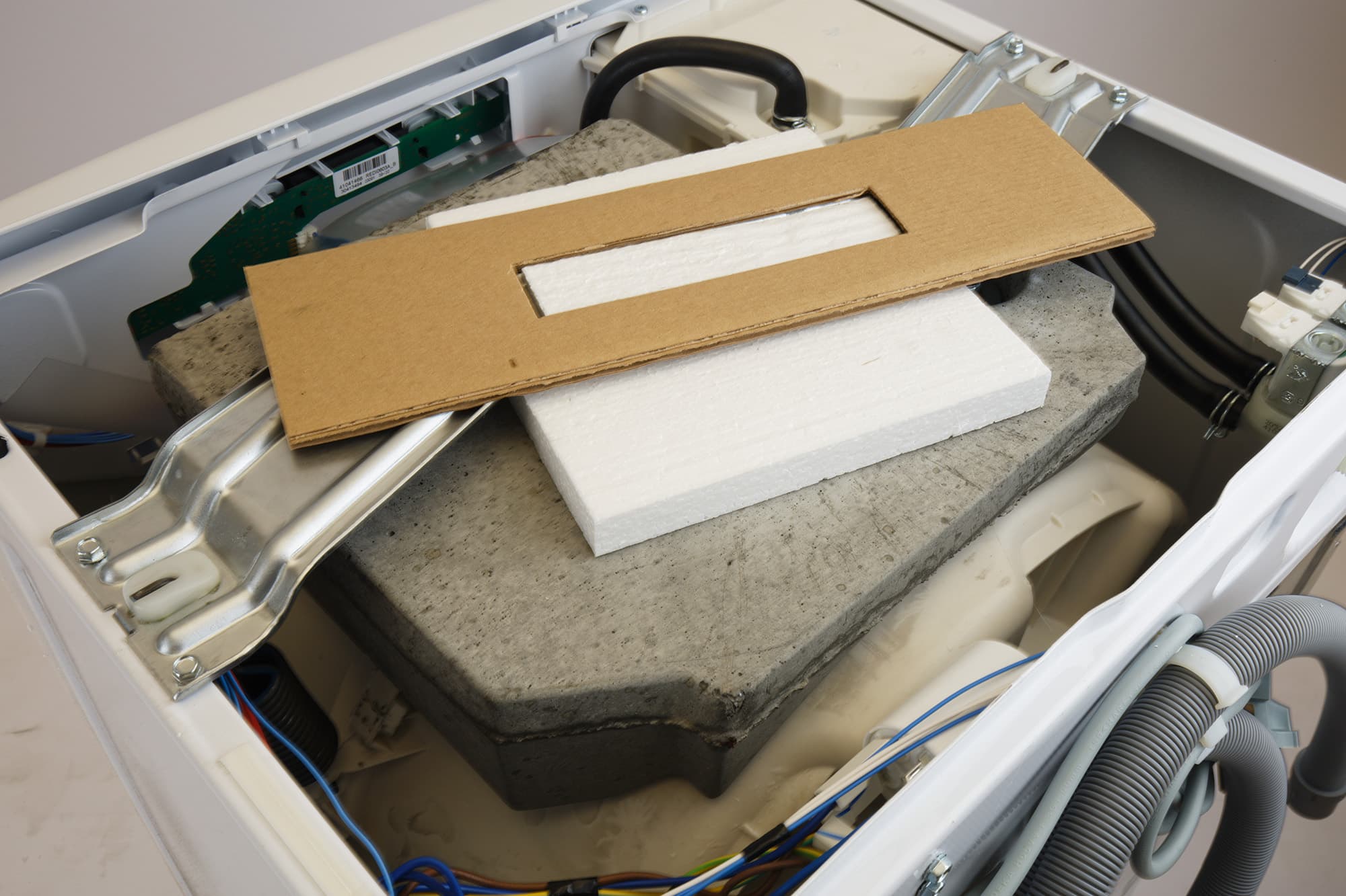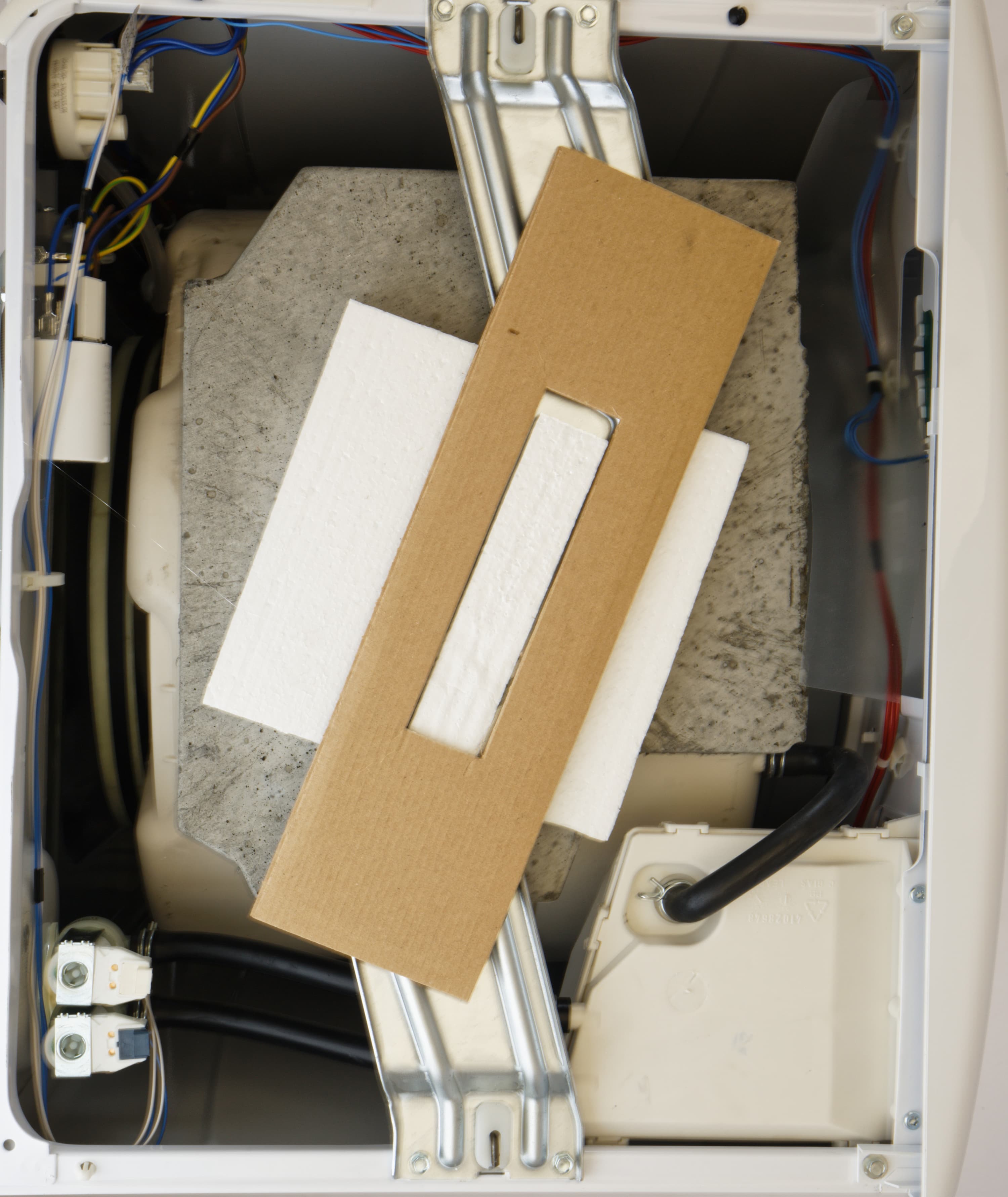 Между крышкой и стальной распоркой, придающей жесткость корпусу, мы обнаружили прокладку из пенопласта и картона. Подивившись такому необычному амортизатору, продолжили осмотр, но поторопились: впоследствии из руководства по инсталляции узнали, что под прокладками находятся два транспортировочных болта. Они удерживают барабан в походном положении, и при установке их следует выкрутить. Таким образом, установка Candy Aqua 114D2-07 требует её частичной разборки, такое нам встречается впервые.