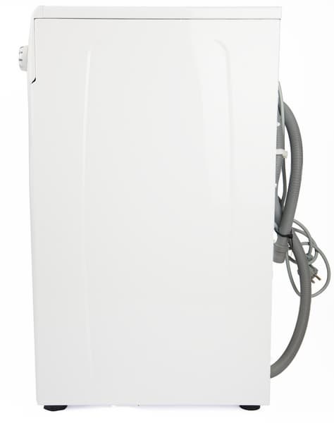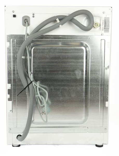 Задняя стенка гладкая. В верхней ее части находится штуцер для подключения заливного шланга, он снабжен съемным сетчатым фильтром, который защищает машину от ржавчины и загрязнений, если они вдруг появятся в водопроводной воде. Из нижней выходит несъемный гофрированный сливной шланг традиционной конструкции. Где же привычные транспортировочные болты, удерживающие барабан?