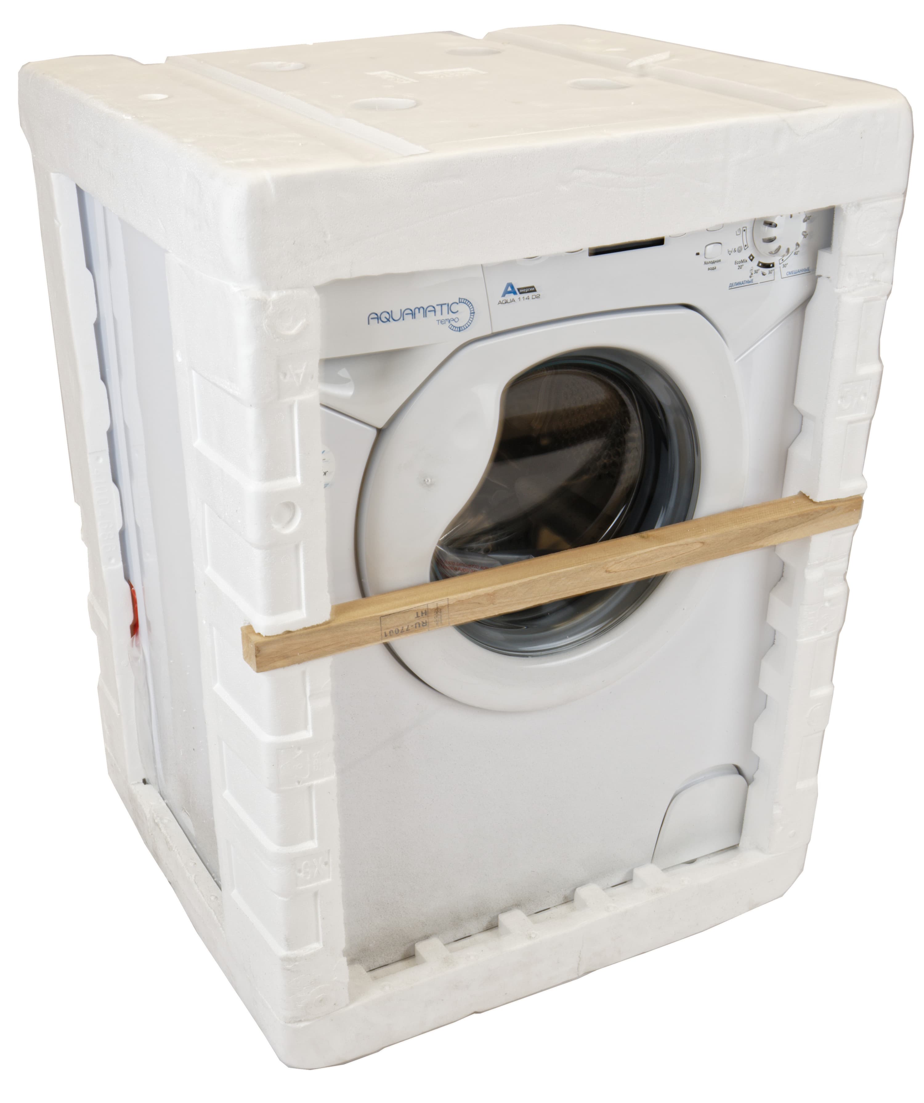 После этого, наклонив машину, нужно вытянуть из-под днища две пенопластовых прокладки, фиксирующие барабан.