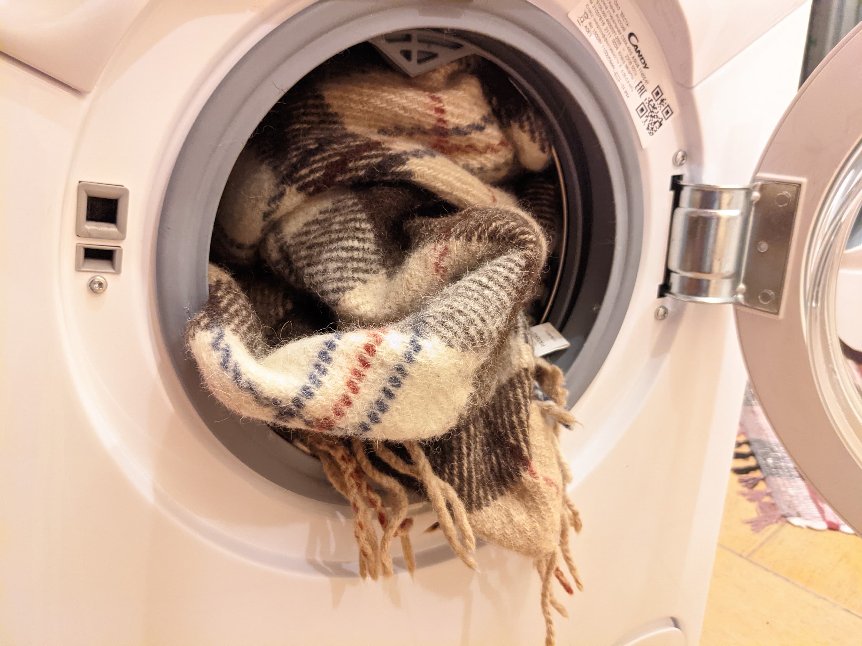 Чтобы проверить, как Candy Aqua 114D2-07 справляется со стиркой деликатных тканей, мы взяли большой шерстяной плед весом около килограмма и загрузили его в машину, выбрав нужный режим.
