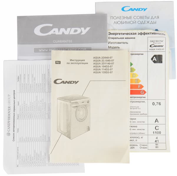 В пакет с документацией вложены также гарантийный талон, список сервисных центров, обязательная наклейка с информацией об энергетической эффективности прибора и небольшой цветной буклет с советами по уходу за одеждой.