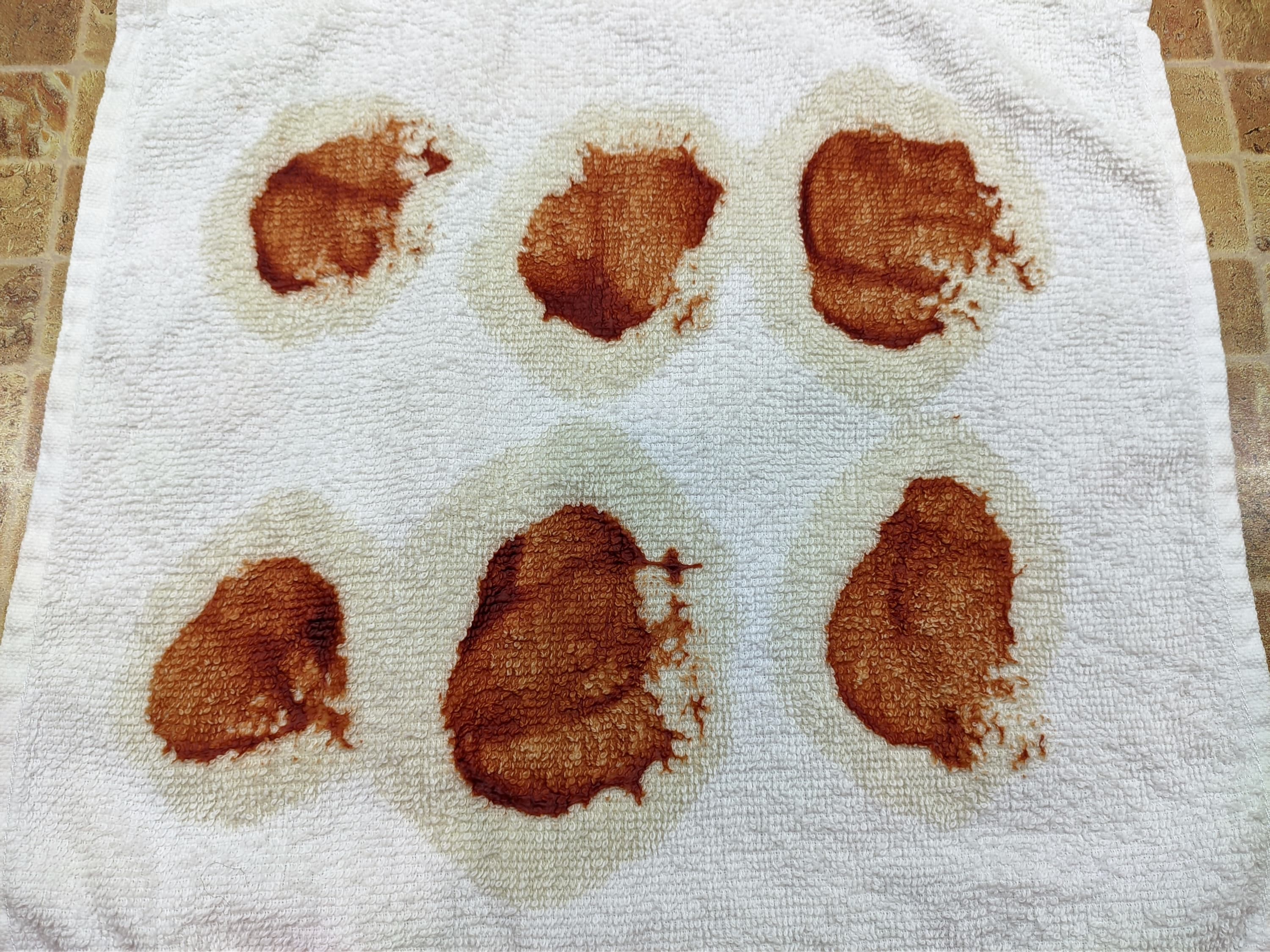 На комплект из белых хлопковых полотенец мы загрязнили красным вином, соевым соусом, кетчупом и какао (на каждом полотенце свое вещество). Загрязнения высушили при комнатной температуре в течение суток, после чего загрузили тестовую стирку.
