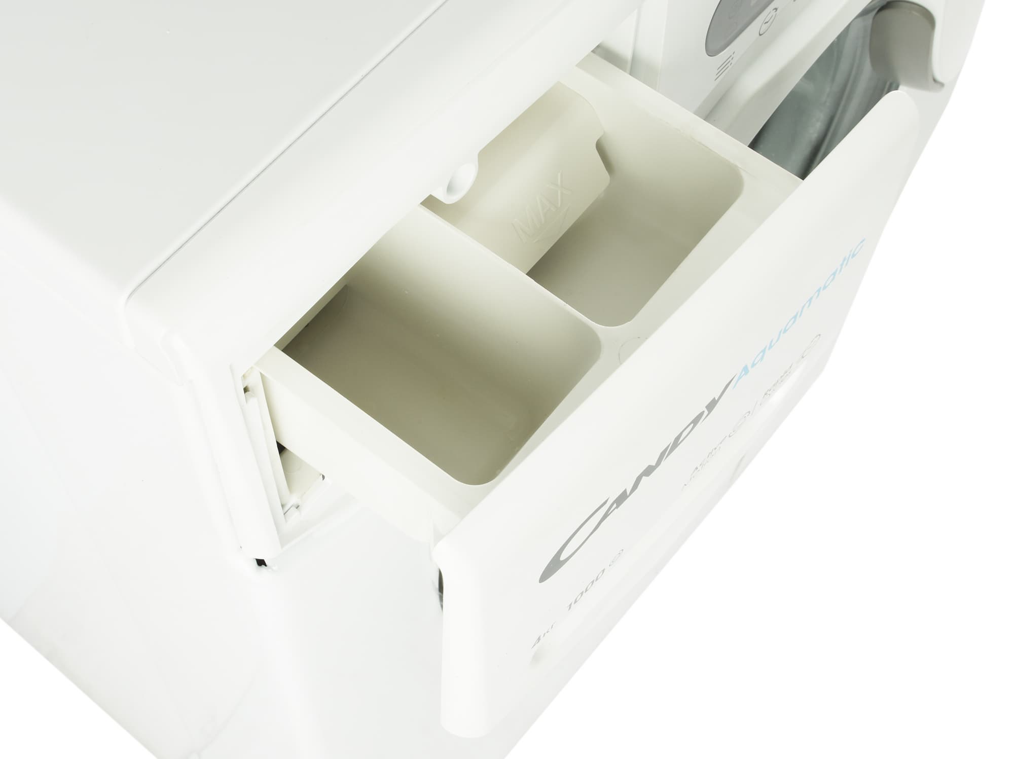 Отсек для моющих средств разделен на две части: одна половина — для стирального порошка или геля, вторая — для ополаскивателя. Опции предварительной стирки у нашей модели не предусмотрено, поэтому и третьего отсека нет.