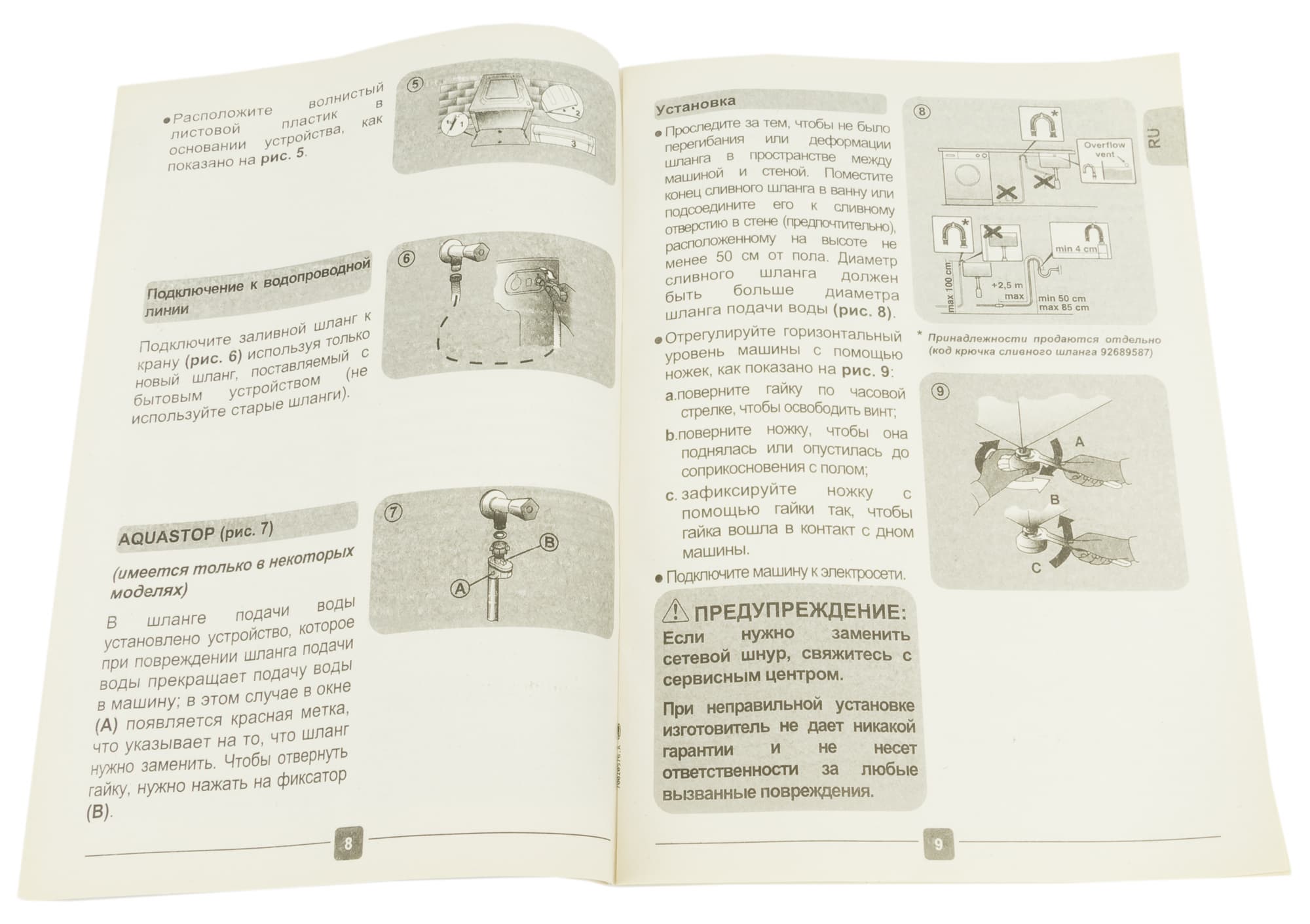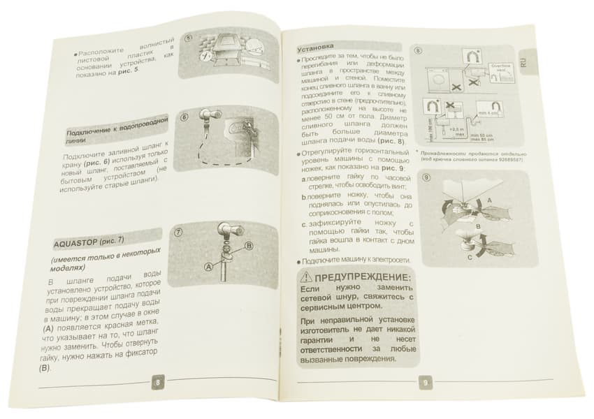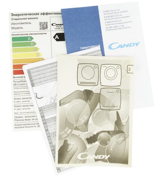 В пакет с документацией вложены также гарантийный талон, список сервисных центров, обязательная наклейка с информацией об энергетической эффективности прибора и небольшой цветной буклет с советами по уходу за одеждой.