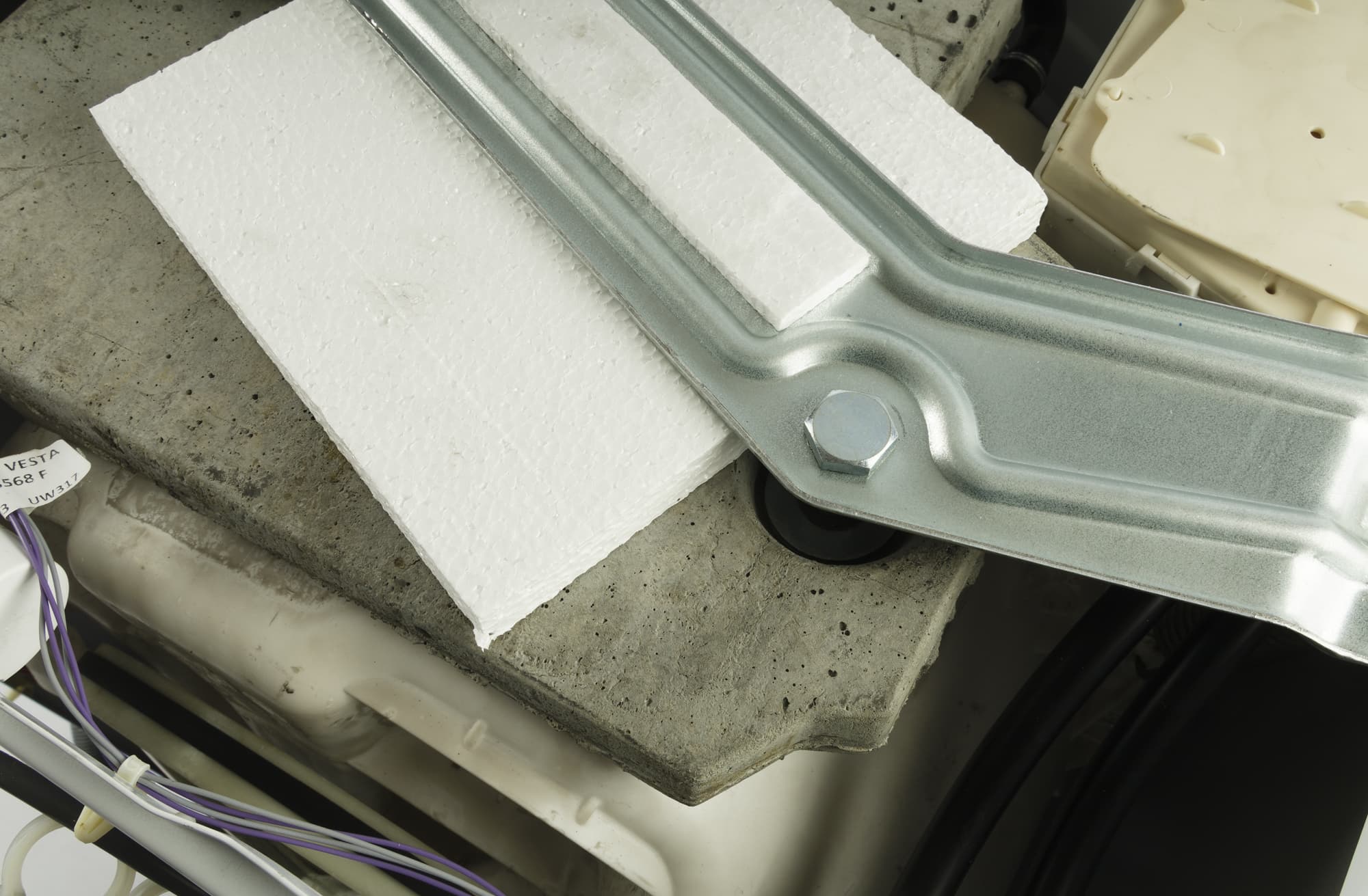 После этого, наклонив машину, нужно вытянуть из-под днища две пенопластовых прокладки, фиксирующие барабан.