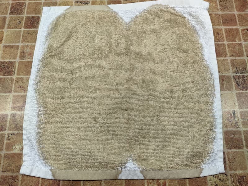 Чтобы избавиться от пятен, сохранившихся от этого и предыдущего тестов, мы еще раз постирали ткань, добавив отбеливатель.