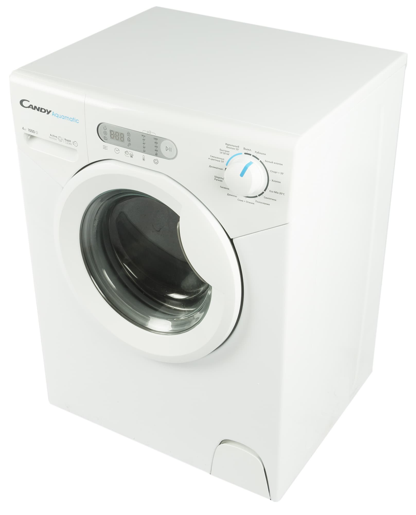 В дополнение к стандартным программам для стирки хлопка, смешанных, деликатных тканей и шерсти у этой модели, как и большинство стиральных машин Candy, есть три фирменных режима для быстрой стирки — на 14, 30 и 59 минут. В нашей модели они расположены на одном положении селектора, а точное время быстрой стирки нужно будет выбрать нажатием на соответствующую кнопку.