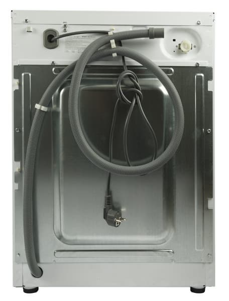 Задняя стенка также имеет выштамповку. В верхней части крышки находится штуцер для подключения заливного шланга, он снабжен съемным сетчатым фильтром, который защищает машину от ржавчины и загрязнений, если они вдруг появятся в водопроводной воде (такое обычно случается при отключении воды и ее повторной подаче — из труб вылетают отложения, которые легко засоряют фильтры в машинках и на смесителях). Снизу, на задней стенке, выходит несъемный гофрированный сливной шланг традиционной конструкции. Транспортировочных болтов в данной модели мы не обнаружили.
